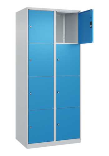 Die wichtigsten Maße des C+P Schließfachschrankes Classic Plus auf einen Blick:Korpus mit einfacher Flügeltür. Die innenliegenden Drehbolzen der einschlagenden Türen bieten den Vorteil einer sauberen Optik, da keine Schrauben oder Scharniere von außen sichtbar sind. Dadurch wird das Design des Schrankes nicht beeinträchtigt und das gesamte Möbelstück wirkt hochwertiger. Damit ist auch die glatte Oberfläche leichter zu reinigen, da keine Schmutz- oder Staubablagerungen an unzugänglichen Stellen zu befürchten sind. Jede Tür ist serienmäßig mit einer Anschlagsdämpfung ausgestattet, so dass, auch durch ein schwungvolles Schließen, die Tür nicht zuknallt. Das trägt nicht nur zu einer angenehmeren Geräuschkulisse bei, sondern schont auch den Stahlschrank vor Beschädigungen. Von der Natur inspiriert schafft der BIONIC Steel Frame eine besonders effiziente und stabile Konstruktion. Durch eine raffinierte innere Struktur aus Faltungen, Streben und Zwischenräumen, sowie höhere Materialstärke an entscheidenden Stellen, wie z. B. im vorderen Bereich der Seitenwände und in den Trennwand- und Kastenprofilen, wird die Verwindungssteifigkeit zusätzlich erhöht. Verschließbar mit Zylinderschloss. Für eine besonders schlanke und raumsparende Optik steht der Schrank ohne Sockel oder Füße direkt auf dem Boden. Lediglich Bodenausgleichsschrauben sorgen für einen wackelfreien Stand bei eventuellen Bodenunebenheiten. Der Schrankboden ist für einen erhöhten Korrosionsschutz zusätzlich verzinkt. Konstruktion aus Stahl, stabil verschweißt. Das macht die Konstruktion besonders robust und widerstandsfähig und somit langlebiger. Die verschweißten Ecken und Kanten des Korpus gewährleisten eine höhere Dichtigkeit und somit eine bessere Schutzfunktion gegen Staub, Feuchtigkeit und Schmutz als eine geschraubte Konstruktion. Zudem sind keine regelmäßigen Wartungsarbeiten und Nachjustierungen nötig. Korpus mit Einbrennlackierung in RAL7035 Lichtgrau. Front mit Einbrennlackierung in RAL5012 Lichtblau.