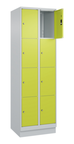 Die wichtigsten Maße des C+P Schließfachschrankes Classic Plus auf einen Blick:Korpus mit einfacher Flügeltür. Die innenliegenden Drehbolzen der einschlagenden Türen bieten den Vorteil einer sauberen Optik, da keine Schrauben oder Scharniere von außen sichtbar sind. Dadurch wird das Design des Schrankes nicht beeinträchtigt und das gesamte Möbelstück wirkt hochwertiger. Damit ist auch die glatte Oberfläche leichter zu reinigen, da keine Schmutz- oder Staubablagerungen an unzugänglichen Stellen zu befürchten sind. Jede Tür ist serienmäßig mit einer Anschlagsdämpfung ausgestattet, so dass, auch durch ein schwungvolles Schließen, die Tür nicht zuknallt. Das trägt nicht nur zu einer angenehmeren Geräuschkulisse bei, sondern schont auch den Stahlschrank vor Beschädigungen. Von der Natur inspiriert schafft der BIONIC Steel Frame eine besonders effiziente und stabile Konstruktion. Durch eine raffinierte innere Struktur aus Faltungen, Streben und Zwischenräumen, sowie höhere Materialstärke an entscheidenden Stellen, wie z. B. im vorderen Bereich der Seitenwände und in den Trennwand- und Kastenprofilen, wird die Verwindungssteifigkeit zusätzlich erhöht. Verschließbar mit Zylinderschloss. Der untergebaute Sockel sorgt dafür, dass das Gewicht des Schrankes gleichmäßig auf dem Boden verteilt wird. Dies erhöht die Stabilität und der Schrank kann schwerer Lasten aufnehmen, als ein Schrank mit Füßen. Außerdem können Schmutz, Staub und Feuchtigkeit nicht unter den Schrank gelangen, was die Reinigungsfläche verkleinert. Konstruktion aus Stahl, stabil verschweißt. Das macht die Konstruktion besonders robust und widerstandsfähig und somit langlebiger. Die verschweißten Ecken und Kanten des Korpus gewährleisten eine höhere Dichtigkeit und somit eine bessere Schutzfunktion gegen Staub, Feuchtigkeit und Schmutz als eine geschraubte Konstruktion. Zudem sind keine regelmäßigen Wartungsarbeiten und Nachjustierungen nötig. Korpus mit Einbrennlackierung in RAL7035 Lichtgrau. Front mit Einbrennlackierung in RDS 110 80 60 Viridingrün.