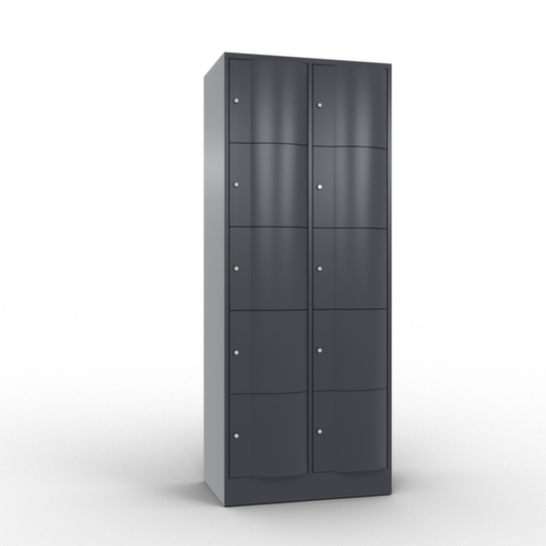 Die nach vorne gewölbte Flügeltür ist absolut stabil und vandalismussicher, sogar gegen Fußtritte. Die einschlagenden Türen sind in robusten, innenliegenden Drehstangenscharnieren aufgehängt und halte damit auch hohen Beanspruchungen stand. Jede Tür ist serienmäßig mit einer Anschlagsdämpfung ausgestattet, so dass, auch durch ein schwungvolles Schließen, die Tür nicht zuknallt. Das trägt nicht nur zu einer angenehmeren Geräuschkulisse bei, sondern schont auch den Stahlschrank vor Beschädigungen. Zudem schützt die Türöffnungsbegrenzung vor einer Überdehnung der Tür und vor der Überschneidung der Nutzfläche mit dem Nachbarschrank. Verschließbar mit Zylinderschloss. Die Lüftungsöffnungen in der Rückwand stellen eine gute Luftzirkulation in jedem Schrankfach sicher. Durch die Abdeckplatte kann der Beistellschrank als zusätzliche Arbeits- oder Ablagefläche genutzt werden. Der untergebaute Sockel sorgt dafür, dass das Gewicht des Schrankes gleichmäßig auf dem Boden verteilt wird. Dies erhöht die Stabilität und der Schrank kann schwerer Lasten aufnehmen, als ein Schrank mit Füßen. Außerdem können Schmutz, Staub und Feuchtigkeit nicht unter den Schrank gelangen, was die Reinigungsfläche verkleinert. Konstruktion aus Stahlblech, verschweißt. Korpus mit Einbrennlackierung. Front mit Einbrennlackierung.