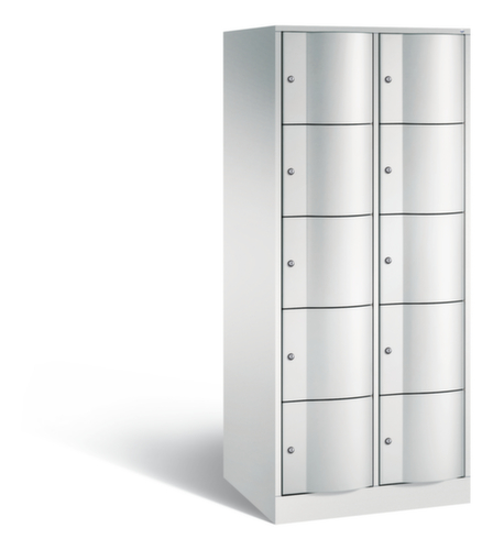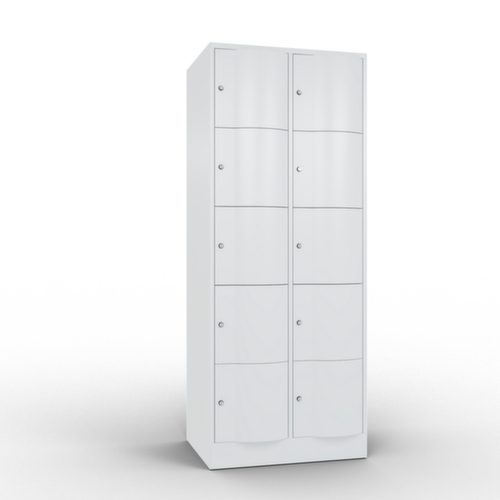 Die nach vorne gewölbte Flügeltür ist absolut stabil und vandalismussicher, sogar gegen Fußtritte. Die einschlagenden Türen sind in robusten, innenliegenden Drehstangenscharnieren aufgehängt und halte damit auch hohen Beanspruchungen stand. Jede Tür ist serienmäßig mit einer Anschlagsdämpfung ausgestattet, so dass, auch durch ein schwungvolles Schließen, die Tür nicht zuknallt. Das trägt nicht nur zu einer angenehmeren Geräuschkulisse bei, sondern schont auch den Stahlschrank vor Beschädigungen. Zudem schützt die Türöffnungsbegrenzung vor einer Überdehnung der Tür und vor der Überschneidung der Nutzfläche mit dem Nachbarschrank. Verschließbar mit Zylinderschloss. Die Lüftungsöffnungen in der Rückwand stellen eine gute Luftzirkulation in jedem Schrankfach sicher. Durch die Abdeckplatte kann der Beistellschrank als zusätzliche Arbeits- oder Ablagefläche genutzt werden. Der untergebaute Sockel sorgt dafür, dass das Gewicht des Schrankes gleichmäßig auf dem Boden verteilt wird. Dies erhöht die Stabilität und der Schrank kann schwerer Lasten aufnehmen, als ein Schrank mit Füßen. Außerdem können Schmutz, Staub und Feuchtigkeit nicht unter den Schrank gelangen, was die Reinigungsfläche verkleinert. Konstruktion aus Stahlblech, verschweißt. Korpus mit Einbrennlackierung. Front mit Einbrennlackierung.
