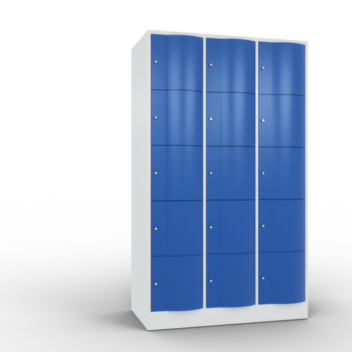 Die nach vorne gewölbte Flügeltür ist absolut stabil und vandalismussicher, sogar gegen Fußtritte. Die einschlagenden Türen sind in robusten, innenliegenden Drehstangenscharnieren aufgehängt und halte damit auch hohen Beanspruchungen stand. Jede Tür ist serienmäßig mit einer Anschlagsdämpfung ausgestattet, so dass, auch durch ein schwungvolles Schließen, die Tür nicht zuknallt. Das trägt nicht nur zu einer angenehmeren Geräuschkulisse bei, sondern schont auch den Stahlschrank vor Beschädigungen. Zudem schützt die Türöffnungsbegrenzung vor einer Überdehnung der Tür und vor der Überschneidung der Nutzfläche mit dem Nachbarschrank. Verschließbar mit Zylinderschloss. Die Lüftungsöffnungen in der Rückwand stellen eine gute Luftzirkulation in jedem Schrankfach sicher. Durch die Abdeckplatte kann der Beistellschrank als zusätzliche Arbeits- oder Ablagefläche genutzt werden. Der untergebaute Sockel sorgt dafür, dass das Gewicht des Schrankes gleichmäßig auf dem Boden verteilt wird. Dies erhöht die Stabilität und der Schrank kann schwerer Lasten aufnehmen, als ein Schrank mit Füßen. Außerdem können Schmutz, Staub und Feuchtigkeit nicht unter den Schrank gelangen, was die Reinigungsfläche verkleinert. Konstruktion aus Stahlblech, verschweißt. Korpus mit Einbrennlackierung. Front mit Einbrennlackierung.