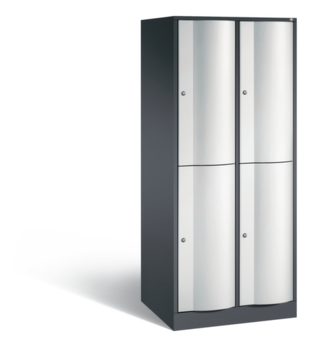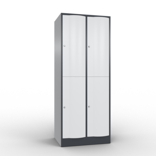Die nach vorne gewölbte Flügeltür ist absolut stabil und vandalismussicher, sogar gegen Fußtritte. Die einschlagenden Türen sind in robusten, innenliegenden Drehstangenscharnieren aufgehängt und halte damit auch hohen Beanspruchungen stand. Jede Tür ist serienmäßig mit einer Anschlagsdämpfung ausgestattet, so dass, auch durch ein schwungvolles Schließen, die Tür nicht zuknallt. Das trägt nicht nur zu einer angenehmeren Geräuschkulisse bei, sondern schont auch den Stahlschrank vor Beschädigungen. Zudem schützt die Türöffnungsbegrenzung vor einer Überdehnung der Tür und vor der Überschneidung der Nutzfläche mit dem Nachbarschrank. Verschließbar mit Zylinderschloss. Die Lüftungsöffnungen in der Rückwand stellen eine gute Luftzirkulation in jedem Schrankfach sicher. Durch die Abdeckplatte kann der Beistellschrank als zusätzliche Arbeits- oder Ablagefläche genutzt werden. Der untergebaute Sockel sorgt dafür, dass das Gewicht des Schrankes gleichmäßig auf dem Boden verteilt wird. Dies erhöht die Stabilität und der Schrank kann schwerer Lasten aufnehmen, als ein Schrank mit Füßen. Außerdem können Schmutz, Staub und Feuchtigkeit nicht unter den Schrank gelangen, was die Reinigungsfläche verkleinert. Konstruktion aus Stahlblech, verschweißt. Korpus mit Einbrennlackierung. Front mit Einbrennlackierung.