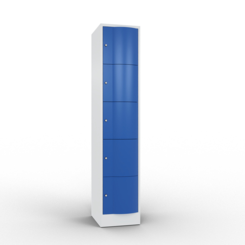 Die nach vorne gewölbte Flügeltür ist absolut stabil und vandalismussicher, sogar gegen Fußtritte. Die einschlagenden Türen sind in robusten, innenliegenden Drehstangenscharnieren aufgehängt und halte damit auch hohen Beanspruchungen stand. Jede Tür ist serienmäßig mit einer Anschlagsdämpfung ausgestattet, so dass, auch durch ein schwungvolles Schließen, die Tür nicht zuknallt. Das trägt nicht nur zu einer angenehmeren Geräuschkulisse bei, sondern schont auch den Stahlschrank vor Beschädigungen. Zudem schützt die Türöffnungsbegrenzung vor einer Überdehnung der Tür und vor der Überschneidung der Nutzfläche mit dem Nachbarschrank. Verschließbar mit Zylinderschloss. Die Lüftungsöffnungen in der Rückwand stellen eine gute Luftzirkulation in jedem Schrankfach sicher. Durch die Abdeckplatte kann der Beistellschrank als zusätzliche Arbeits- oder Ablagefläche genutzt werden. Der untergebaute Sockel sorgt dafür, dass das Gewicht des Schrankes gleichmäßig auf dem Boden verteilt wird. Dies erhöht die Stabilität und der Schrank kann schwerer Lasten aufnehmen, als ein Schrank mit Füßen. Außerdem können Schmutz, Staub und Feuchtigkeit nicht unter den Schrank gelangen, was die Reinigungsfläche verkleinert. Konstruktion aus Stahlblech, verschweißt. Korpus mit Einbrennlackierung. Front mit Einbrennlackierung.