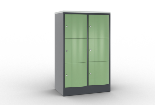 Die nach vorne gewölbte Flügeltür ist absolut stabil und vandalismussicher, sogar gegen Fußtritte. Die einschlagenden Türen sind in robusten, innenliegenden Drehstangenscharnieren aufgehängt und halte damit auch hohen Beanspruchungen stand. Jede Tür ist serienmäßig mit einer Anschlagsdämpfung ausgestattet, so dass, auch durch ein schwungvolles Schließen, die Tür nicht zuknallt. Das trägt nicht nur zu einer angenehmeren Geräuschkulisse bei, sondern schont auch den Stahlschrank vor Beschädigungen. Zudem schützt die Türöffnungsbegrenzung vor einer Überdehnung der Tür und vor der Überschneidung der Nutzfläche mit dem Nachbarschrank. Verschließbar mit Zylinderschloss. Die Lüftungsöffnungen in der Rückwand stellen eine gute Luftzirkulation in jedem Schrankfach sicher. Durch die Abdeckplatte kann der Beistellschrank als zusätzliche Arbeits- oder Ablagefläche genutzt werden. Der untergebaute Sockel sorgt dafür, dass das Gewicht des Schrankes gleichmäßig auf dem Boden verteilt wird. Dies erhöht die Stabilität und der Schrank kann schwerer Lasten aufnehmen, als ein Schrank mit Füßen. Außerdem können Schmutz, Staub und Feuchtigkeit nicht unter den Schrank gelangen, was die Reinigungsfläche verkleinert. Konstruktion aus Stahlblech, verschweißt. Korpus mit Einbrennlackierung. Front mit Einbrennlackierung. Platte in Dekor Korpusfarbe.