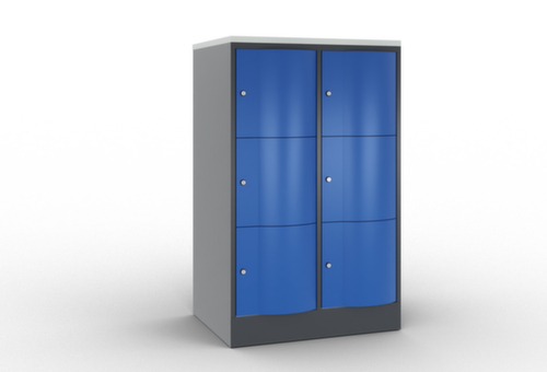 Die nach vorne gewölbte Flügeltür ist absolut stabil und vandalismussicher, sogar gegen Fußtritte. Die einschlagenden Türen sind in robusten, innenliegenden Drehstangenscharnieren aufgehängt und halte damit auch hohen Beanspruchungen stand. Jede Tür ist serienmäßig mit einer Anschlagsdämpfung ausgestattet, so dass, auch durch ein schwungvolles Schließen, die Tür nicht zuknallt. Das trägt nicht nur zu einer angenehmeren Geräuschkulisse bei, sondern schont auch den Stahlschrank vor Beschädigungen. Zudem schützt die Türöffnungsbegrenzung vor einer Überdehnung der Tür und vor der Überschneidung der Nutzfläche mit dem Nachbarschrank. Verschließbar mit Zylinderschloss. Die Lüftungsöffnungen in der Rückwand stellen eine gute Luftzirkulation in jedem Schrankfach sicher. Durch die Abdeckplatte kann der Beistellschrank als zusätzliche Arbeits- oder Ablagefläche genutzt werden. Der untergebaute Sockel sorgt dafür, dass das Gewicht des Schrankes gleichmäßig auf dem Boden verteilt wird. Dies erhöht die Stabilität und der Schrank kann schwerer Lasten aufnehmen, als ein Schrank mit Füßen. Außerdem können Schmutz, Staub und Feuchtigkeit nicht unter den Schrank gelangen, was die Reinigungsfläche verkleinert. Konstruktion aus Stahlblech, verschweißt. Korpus mit Einbrennlackierung. Front mit Einbrennlackierung. Platte in Dekor Korpusfarbe.