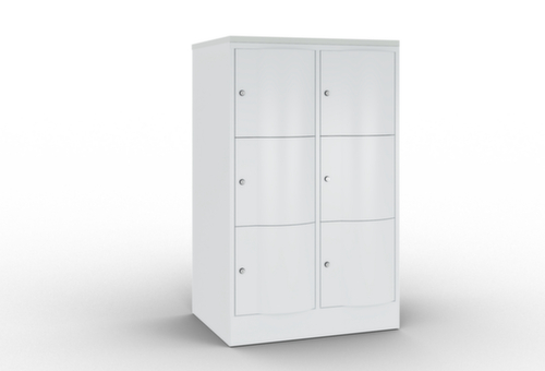 Die nach vorne gewölbte Flügeltür ist absolut stabil und vandalismussicher, sogar gegen Fußtritte. Die einschlagenden Türen sind in robusten, innenliegenden Drehstangenscharnieren aufgehängt und halte damit auch hohen Beanspruchungen stand. Jede Tür ist serienmäßig mit einer Anschlagsdämpfung ausgestattet, so dass, auch durch ein schwungvolles Schließen, die Tür nicht zuknallt. Das trägt nicht nur zu einer angenehmeren Geräuschkulisse bei, sondern schont auch den Stahlschrank vor Beschädigungen. Zudem schützt die Türöffnungsbegrenzung vor einer Überdehnung der Tür und vor der Überschneidung der Nutzfläche mit dem Nachbarschrank. Verschließbar mit Zylinderschloss. Die Lüftungsöffnungen in der Rückwand stellen eine gute Luftzirkulation in jedem Schrankfach sicher. Durch die Abdeckplatte kann der Beistellschrank als zusätzliche Arbeits- oder Ablagefläche genutzt werden. Der untergebaute Sockel sorgt dafür, dass das Gewicht des Schrankes gleichmäßig auf dem Boden verteilt wird. Dies erhöht die Stabilität und der Schrank kann schwerer Lasten aufnehmen, als ein Schrank mit Füßen. Außerdem können Schmutz, Staub und Feuchtigkeit nicht unter den Schrank gelangen, was die Reinigungsfläche verkleinert. Konstruktion aus Stahlblech, verschweißt. Korpus mit Einbrennlackierung. Front mit Einbrennlackierung. Platte in Dekor Korpusfarbe.
