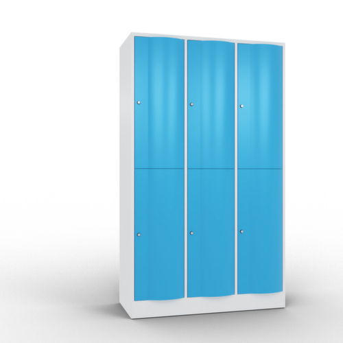 Die nach vorne gewölbte Flügeltür ist absolut stabil und vandalismussicher, sogar gegen Fußtritte. Die einschlagenden Türen sind in robusten, innenliegenden Drehstangenscharnieren aufgehängt und halte damit auch hohen Beanspruchungen stand. Jede Tür ist serienmäßig mit einer Anschlagsdämpfung ausgestattet, so dass, auch durch ein schwungvolles Schließen, die Tür nicht zuknallt. Das trägt nicht nur zu einer angenehmeren Geräuschkulisse bei, sondern schont auch den Stahlschrank vor Beschädigungen. Zudem schützt die Türöffnungsbegrenzung vor einer Überdehnung der Tür und vor der Überschneidung der Nutzfläche mit dem Nachbarschrank. Verschließbar mit Zylinderschloss. Die Lüftungsöffnungen in der Rückwand stellen eine gute Luftzirkulation in jedem Schrankfach sicher. Durch die Abdeckplatte kann der Beistellschrank als zusätzliche Arbeits- oder Ablagefläche genutzt werden. Der untergebaute Sockel sorgt dafür, dass das Gewicht des Schrankes gleichmäßig auf dem Boden verteilt wird. Dies erhöht die Stabilität und der Schrank kann schwerer Lasten aufnehmen, als ein Schrank mit Füßen. Außerdem können Schmutz, Staub und Feuchtigkeit nicht unter den Schrank gelangen, was die Reinigungsfläche verkleinert. Konstruktion aus Stahlblech, verschweißt. Korpus mit Einbrennlackierung. Front mit Einbrennlackierung.