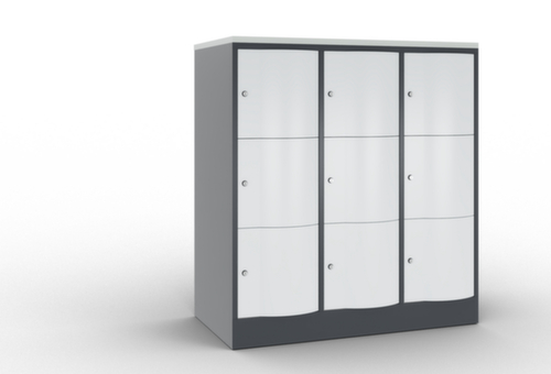 Die nach vorne gewölbte Flügeltür ist absolut stabil und vandalismussicher, sogar gegen Fußtritte. Die einschlagenden Türen sind in robusten, innenliegenden Drehstangenscharnieren aufgehängt und halte damit auch hohen Beanspruchungen stand. Jede Tür ist serienmäßig mit einer Anschlagsdämpfung ausgestattet, so dass, auch durch ein schwungvolles Schließen, die Tür nicht zuknallt. Das trägt nicht nur zu einer angenehmeren Geräuschkulisse bei, sondern schont auch den Stahlschrank vor Beschädigungen. Zudem schützt die Türöffnungsbegrenzung vor einer Überdehnung der Tür und vor der Überschneidung der Nutzfläche mit dem Nachbarschrank. Verschließbar mit Zylinderschloss. Die Lüftungsöffnungen in der Rückwand stellen eine gute Luftzirkulation in jedem Schrankfach sicher. Durch die Abdeckplatte kann der Beistellschrank als zusätzliche Arbeits- oder Ablagefläche genutzt werden. Der untergebaute Sockel sorgt dafür, dass das Gewicht des Schrankes gleichmäßig auf dem Boden verteilt wird. Dies erhöht die Stabilität und der Schrank kann schwerer Lasten aufnehmen, als ein Schrank mit Füßen. Außerdem können Schmutz, Staub und Feuchtigkeit nicht unter den Schrank gelangen, was die Reinigungsfläche verkleinert. Konstruktion aus Stahlblech, verschweißt. Korpus mit Einbrennlackierung. Front mit Einbrennlackierung. Platte in Dekor Korpusfarbe.