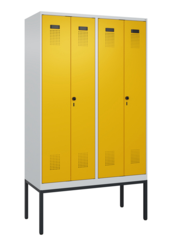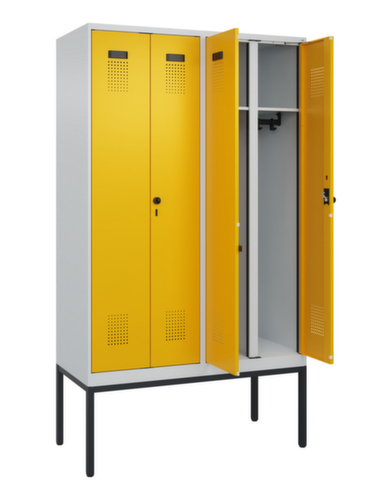 Die wichtigsten Maße des C+P Garderobenschranks Evolo PLUS auf einen Blick:Je Abteil ein festverschweißter Hutboden und darunter eine Kleiderstange mit 3 verdrehsicheren Doppelschiebehaken. Die Doppel-Flügeltüren können über den Comfort-Etikettrahmen ganz einfach personalisiert werden. Dank des Desinglochbildes, was essentiell zur Belüftung beiträgt, bleibt der Schrank trotzdem in seinem gesamten Erscheinungsbild glatt, hygienisch und leicht zu reinigen. Die innenliegenden Drehbolzen der einschlagenden Türen bieten den Vorteil einer sauberen Optik, da keine Schrauben oder Scharniere von außen sichtbar sind. Dadurch wird das Design des Schrankes nicht beeinträchtigt und das gesamte Möbelstück wirkt hochwertiger. Damit ist auch die glatte Oberfläche leichter zu reinigen, da keine Schmutz- oder Staubablagerungen an unzugänglichen Stellen zu befürchten sind. Jede Tür ist serienmäßig mit einer Anschlagsdämpfung ausgestattet, so dass, auch durch ein schwungvolles Schließen, die Tür nicht zuknallt. Das trägt nicht nur zu einer angenehmeren Geräuschkulisse bei, sondern schont auch den Stahlschrank vor Beschädigungen. Von der Natur inspiriert schafft der BIONIC Steel Frame eine besonders effiziente und stabile Konstruktion. Durch eine raffinierte innere Struktur aus Faltungen, Streben und Zwischenräumen, sowie höhere Materialstärke an entscheidenden Stellen, wie z. B. im vorderen Bereich der Seitenwände und in den Trennwand- und Kastenprofilen, wird die Verwindungssteifigkeit zusätzlich erhöht. Pro Person stehen 2 Abteile zur Verfügung, die über die zueinander schlagenden Türen gemeinsam verschließbar sind. Dadurch ist eine strikte und saubere Trennung von Arbeits- und Alltagskleidung ganz einfach möglich. Das durchdachte Selbstbelüftungskonzept ermöglicht einen konstruktiv optimierte Luftzirkulation. Definierte Lüftungsfreiräume vor und hinter dem Ablageboden, Lüftungsöffnungen in Abteilboden und -dach, in Kombination mit dem Lochbild in der Tür, tragen zu einer angenehmen Strömungsverlauf bei. . Dadurch wird der Schrankinhalt ausreichend belüftet und trocknet schneller, ohne unangenehme Gerüche zu verursachen. Das untergebaute Fußgestell reduziert mögliche Ansammlungen von Schmutz und Staub, da eine vollflächige Reinigung einfach möglich ist. Zudem wird zusätzlicher Stauraum unter dem Schrank geschaffen. Schuhe und Taschen stehen nicht mehr im Raum und stellen weniger Stolpergefahr dar. Konstruktion aus Stahl, stabil verschweißt. Das macht die Konstruktion besonders robust und widerstandsfähig und somit langlebiger. Die verschweißten Ecken und Kanten des Korpus gewährleisten eine höhere Dichtigkeit und somit eine bessere Schutzfunktion gegen Staub, Feuchtigkeit und Schmutz als eine geschraubte Konstruktion. Zudem sind keine regelmäßigen Wartungsarbeiten und Nachjustierungen nötig. Korpus mit Einbrennlackierung in RAL7035 Lichtgrau, Front mit Einbrennlackierung in RAL1004 Goldgelb.
