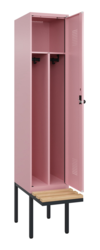Die wichtigsten Maße des C+P Garderobenschranks Evolo PLUS auf einen Blick:Je Abteil ein festverschweißter Hutboden und darunter zwei Kleiderstangen mit je 2 verdrehsicheren Doppelschiebehaken. Das Abteil wird unter dem Hutboden durch eine Mitteltrennwand unterteilt. Dadurch ist eine saubere Schwarz-Weiß-Trennung von Arbeits- und Alltagskleidung möglich. Die Flügeltüren können über den Comfort-Etikettrahmen ganz einfach personalisiert werden. Dank des Desinglochbildes, was essentiell zur Belüftung beiträgt, bleibt der Schrank trotzdem in seinem gesamten Erscheinungsbild glatt, hygienisch und leicht zu reinigen. Die innenliegenden Drehbolzen der einschlagenden Türen bieten den Vorteil einer sauberen Optik, da keine Schrauben oder Scharniere von außen sichtbar sind. Dadurch wird das Design des Schrankes nicht beeinträchtigt und das gesamte Möbelstück wirkt hochwertiger. Damit ist auch die glatte Oberfläche leichter zu reinigen, da keine Schmutz- oder Staubablagerungen an unzugänglichen Stellen zu befürchten sind. Jede Tür ist serienmäßig mit einer Anschlagsdämpfung ausgestattet, so dass, auch durch ein schwungvolles Schließen, die Tür nicht zuknallt. Das trägt nicht nur zu einer angenehmeren Geräuschkulisse bei, sondern schont auch den Stahlschrank vor Beschädigungen. Von der Natur inspiriert schafft der BIONIC Steel Frame eine besonders effiziente und stabile Konstruktion. Durch eine raffinierte innere Struktur aus Faltungen, Streben und Zwischenräumen, sowie höhere Materialstärke an entscheidenden Stellen, wie z. B. im vorderen Bereich der Seitenwände und in den Trennwand- und Kastenprofilen, wird die Verwindungssteifigkeit zusätzlich erhöht. Das durchdachte Selbstbelüftungskonzept ermöglicht einen konstruktiv optimierte Luftzirkulation. Definierte Lüftungsfreiräume vor und hinter dem Ablageboden, Lüftungsöffnungen in Abteilboden und -dach, in Kombination mit dem Lochbild in der Tür, tragen zu einer angenehmen Strömungsverlauf bei. . Dadurch wird der Schrankinhalt ausreichend belüftet und trocknet schneller, ohne unangenehme Gerüche zu verursachen. Die schwebende Sitzbank bietet mehr Freiraum für ein bequemes An- und Ausziehen, ohne dass die Füße des Gestells im Weg sind. Die Leisten sind aus gehobeltem, abgerundeten Buchen-Hartholz - für eine warme, natürliche Optik und hohen Sitzkomfort. Das untergebaute Fußgestell reduziert mögliche Ansammlungen von Schmutz und Staub, da eine vollflächige Reinigung einfach möglich ist. Zudem wird zusätzlicher Stauraum unter dem Schrank geschaffen. Schuhe und Taschen stehen nicht mehr im Raum und stellen weniger Stolpergefahr dar. Konstruktion aus Stahl, stabil verschweißt. Das macht die Konstruktion besonders robust und widerstandsfähig und somit langlebiger. Die verschweißten Ecken und Kanten des Korpus gewährleisten eine höhere Dichtigkeit und somit eine bessere Schutzfunktion gegen Staub, Feuchtigkeit und Schmutz als eine geschraubte Konstruktion. Zudem sind keine regelmäßigen Wartungsarbeiten und Nachjustierungen nötig. Korpus mit Einbrennlackierung in RAL3015 Hellrosa, Front mit Einbrennlackierung in RAL3015 Hellrosa.