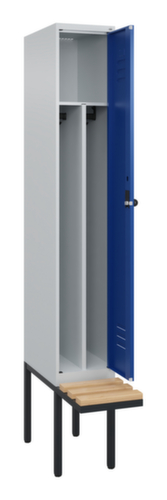 Die wichtigsten Maße des C+P Garderobenschranks Classic Plus auf einen Blick:Je Abteil Hutboden, Kleiderstange, Haken. Das Abteil wird unter dem Hutboden durch eine Mitteltrennwand unterteilt. Dadurch ist eine saubere Schwarz-Weiß-Trennung von Arbeits- und Alltagskleidung möglich. Flügeltür mit Etikettenrahmen und Lüftungsschlitzen. Die innenliegenden Drehbolzen der einschlagenden Türen bieten den Vorteil einer sauberen Optik, da keine Schrauben oder Scharniere von außen sichtbar sind. Dadurch wird das Design des Schrankes nicht beeinträchtigt und das gesamte Möbelstück wirkt hochwertiger. Damit ist auch die glatte Oberfläche leichter zu reinigen, da keine Schmutz- oder Staubablagerungen an unzugänglichen Stellen zu befürchten sind. Jede Tür ist serienmäßig mit einer Anschlagsdämpfung ausgestattet, so dass, auch durch ein schwungvolles Schließen, die Tür nicht zuknallt. Das trägt nicht nur zu einer angenehmeren Geräuschkulisse bei, sondern schont auch den Stahlschrank vor Beschädigungen. Von der Natur inspiriert schafft der BIONIC Steel Frame eine besonders effiziente und stabile Konstruktion. Durch eine raffinierte innere Struktur aus Faltungen, Streben und Zwischenräumen, sowie höhere Materialstärke an entscheidenden Stellen, wie z. B. im vorderen Bereich der Seitenwände und in den Trennwand- und Kastenprofilen, wird die Verwindungssteifigkeit zusätzlich erhöht. Verschließbar mit Sicherheits-Drehriegel für Vorhängeschloss. Das Sicherheitsschloss ist besonders aufbruchsicher, da es im verschlossenen Zustand durchdreht und erst nach Entfernung des Schlosses einrastet. Passend für alle Vorhängeschlösser mit einer Bügelstärke von 6 - 8 mm. Die zusätzlichen Lüftungsöffnungen im Abteil, kombiniert mit den Lüftungsschlitzen in der Tür, verbessern den Luftstrom. Dadurch wird der Schrankinhalt besser belüftet und trocknet schneller, ohne unangenehme Gerüche zu verursachen. vorgebaute Sitzbank. Die Leisten sind aus Buchenholz. Konstruktion aus Stahl, stabil verschweißt. Das macht die Konstruktion besonders robust und widerstandsfähig und somit langlebiger. Die verschweißten Ecken und Kanten des Korpus gewährleisten eine höhere Dichtigkeit und somit eine bessere Schutzfunktion gegen Staub, Feuchtigkeit und Schmutz als eine geschraubte Konstruktion. Zudem sind keine regelmäßigen Wartungsarbeiten und Nachjustierungen nötig. Korpus mit Einbrennlackierung in RAL7035 Lichtgrau, Front mit Einbrennlackierung in RAL5010 Enzianblau.