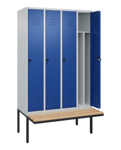 Die wichtigsten Maße des C+P Garderobenschranks Classic Plus auf einen Blick:Je Abteil Hutboden, Kleiderstange, Haken. Das Abteil wird unter dem Hutboden durch eine Mitteltrennwand unterteilt. Dadurch ist eine saubere Schwarz-Weiß-Trennung von Arbeits- und Alltagskleidung möglich. Flügeltür mit Etikettenrahmen und Lüftungsschlitzen. Die innenliegenden Drehbolzen der einschlagenden Türen bieten den Vorteil einer sauberen Optik, da keine Schrauben oder Scharniere von außen sichtbar sind. Dadurch wird das Design des Schrankes nicht beeinträchtigt und das gesamte Möbelstück wirkt hochwertiger. Damit ist auch die glatte Oberfläche leichter zu reinigen, da keine Schmutz- oder Staubablagerungen an unzugänglichen Stellen zu befürchten sind. Jede Tür ist serienmäßig mit einer Anschlagsdämpfung ausgestattet, so dass, auch durch ein schwungvolles Schließen, die Tür nicht zuknallt. Das trägt nicht nur zu einer angenehmeren Geräuschkulisse bei, sondern schont auch den Stahlschrank vor Beschädigungen. Von der Natur inspiriert schafft der BIONIC Steel Frame eine besonders effiziente und stabile Konstruktion. Durch eine raffinierte innere Struktur aus Faltungen, Streben und Zwischenräumen, sowie höhere Materialstärke an entscheidenden Stellen, wie z. B. im vorderen Bereich der Seitenwände und in den Trennwand- und Kastenprofilen, wird die Verwindungssteifigkeit zusätzlich erhöht. Verschließbar mit Sicherheits-Drehriegel für Vorhängeschloss. Das Sicherheitsschloss ist besonders aufbruchsicher, da es im verschlossenen Zustand durchdreht und erst nach Entfernung des Schlosses einrastet. Passend für alle Vorhängeschlösser mit einer Bügelstärke von 6 - 8 mm. Die zusätzlichen Lüftungsöffnungen im Abteil, kombiniert mit den Lüftungsschlitzen in der Tür, verbessern den Luftstrom. Dadurch wird der Schrankinhalt besser belüftet und trocknet schneller, ohne unangenehme Gerüche zu verursachen. vorgebaute Sitzbank. Die Leisten sind aus Buchenholz. Konstruktion aus Stahl, stabil verschweißt. Das macht die Konstruktion besonders robust und widerstandsfähig und somit langlebiger. Die verschweißten Ecken und Kanten des Korpus gewährleisten eine höhere Dichtigkeit und somit eine bessere Schutzfunktion gegen Staub, Feuchtigkeit und Schmutz als eine geschraubte Konstruktion. Zudem sind keine regelmäßigen Wartungsarbeiten und Nachjustierungen nötig. Korpus mit Einbrennlackierung in RAL7035 Lichtgrau, Front mit Einbrennlackierung in RAL5010 Enzianblau.