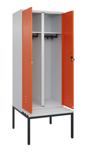 Die wichtigsten Maße des C+P Garderobenschranks Classic Plus auf einen Blick:Je Abteil ein festverschweißter Hutboden und darunter eine Kleiderstange mit 3 verdrehsicheren Doppelschiebehaken. Doppel-Flügeltür mit Lüftungsschlitzen und Etikettenrahmen. Die innenliegenden Drehbolzen der einschlagenden Türen bieten den Vorteil einer sauberen Optik, da keine Schrauben oder Scharniere von außen sichtbar sind. Dadurch wird das Design des Schrankes nicht beeinträchtigt und das gesamte Möbelstück wirkt hochwertiger. Damit ist auch die glatte Oberfläche leichter zu reinigen, da keine Schmutz- oder Staubablagerungen an unzugänglichen Stellen zu befürchten sind. Jede Tür ist serienmäßig mit einer Anschlagsdämpfung ausgestattet, so dass, auch durch ein schwungvolles Schließen, die Tür nicht zuknallt. Das trägt nicht nur zu einer angenehmeren Geräuschkulisse bei, sondern schont auch den Stahlschrank vor Beschädigungen. Von der Natur inspiriert schafft der BIONIC Steel Frame eine besonders effiziente und stabile Konstruktion. Durch eine raffinierte innere Struktur aus Faltungen, Streben und Zwischenräumen, sowie höhere Materialstärke an entscheidenden Stellen, wie z. B. im vorderen Bereich der Seitenwände und in den Trennwand- und Kastenprofilen, wird die Verwindungssteifigkeit zusätzlich erhöht. Verschließbar mit Sicherheits-Drehriegel für Vorhängeschloss. Das Sicherheitsschloss ist besonders aufbruchsicher, da es im verschlossenen Zustand durchdreht und erst nach Entfernung des Schlosses einrastet. Passend für alle Vorhängeschlösser mit einer Bügelstärke von 6 - 8 mm. Pro Person stehen 2 Abteile zur Verfügung, die über die zueinander schlagenden Türen gemeinsam verschließbar sind. Dadurch ist eine strikte und saubere Trennung von Arbeits- und Alltagskleidung ganz einfach möglich. Die zusätzlichen Lüftungsöffnungen im Abteil, kombiniert mit den Lüftungsschlitzen in der Tür, verbessern den Luftstrom. Dadurch wird der Schrankinhalt besser belüftet und trocknet schneller, ohne unangenehme Gerüche zu verursachen. Die untergebaute Sitzbank sorgt für eine effiziente Nutzung des verfügbaren Raumes. Sie ermöglicht ein bequemes An- und Ausziehen und bietet direkt noch Stauraum, ohne zusätzlichen Platz zu beanspruchen. Die Leisten sind aus Kunststoff. Konstruktion aus Stahl, stabil verschweißt. Das macht die Konstruktion besonders robust und widerstandsfähig und somit langlebiger. Die verschweißten Ecken und Kanten des Korpus gewährleisten eine höhere Dichtigkeit und somit eine bessere Schutzfunktion gegen Staub, Feuchtigkeit und Schmutz als eine geschraubte Konstruktion. Zudem sind keine regelmäßigen Wartungsarbeiten und Nachjustierungen nötig. Korpus mit Einbrennlackierung in RAL7035 Lichtgrau, Front mit Einbrennlackierung in RAL2004 Reinorange.