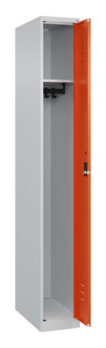 Die wichtigsten Maße des C+P Garderobenschranks Classic Plus auf einen Blick:Je Abteil ein festverschweißter Hutboden und darunter eine Kleiderstange mit 3 verdrehsicheren Doppelschiebehaken. Flügeltür mit Etikettenrahmen und Lüftungsschlitzen. Die innenliegenden Drehbolzen der einschlagenden Türen bieten den Vorteil einer sauberen Optik, da keine Schrauben oder Scharniere von außen sichtbar sind. Dadurch wird das Design des Schrankes nicht beeinträchtigt und das gesamte Möbelstück wirkt hochwertiger. Damit ist auch die glatte Oberfläche leichter zu reinigen, da keine Schmutz- oder Staubablagerungen an unzugänglichen Stellen zu befürchten sind. Jede Tür ist serienmäßig mit einer Anschlagsdämpfung ausgestattet, so dass, auch durch ein schwungvolles Schließen, die Tür nicht zuknallt. Das trägt nicht nur zu einer angenehmeren Geräuschkulisse bei, sondern schont auch den Stahlschrank vor Beschädigungen. Von der Natur inspiriert schafft der BIONIC Steel Frame eine besonders effiziente und stabile Konstruktion. Durch eine raffinierte innere Struktur aus Faltungen, Streben und Zwischenräumen, sowie höhere Materialstärke an entscheidenden Stellen, wie z. B. im vorderen Bereich der Seitenwände und in den Trennwand- und Kastenprofilen, wird die Verwindungssteifigkeit zusätzlich erhöht. Verschließbar mit Zylinderschloss. Die zusätzlichen Lüftungsöffnungen im Abteil, kombiniert mit den Lüftungsschlitzen in der Tür, verbessern den Luftstrom. Dadurch wird der Schrankinhalt besser belüftet und trocknet schneller, ohne unangenehme Gerüche zu verursachen. Für eine besonders schlanke und raumsparende Optik steht der Schrank ohne Sockel oder Füße direkt auf dem Boden. Lediglich Bodenausgleichsschrauben sorgen für einen wackelfreien Stand bei eventuellen Bodenunebenheiten. Der Schrankboden ist für einen erhöhten Korrosionsschutz zusätzlich verzinkt. Konstruktion aus Stahl, stabil verschweißt. Das macht die Konstruktion besonders robust und widerstandsfähig und somit langlebiger. Die verschweißten Ecken und Kanten des Korpus gewährleisten eine höhere Dichtigkeit und somit eine bessere Schutzfunktion gegen Staub, Feuchtigkeit und Schmutz als eine geschraubte Konstruktion. Zudem sind keine regelmäßigen Wartungsarbeiten und Nachjustierungen nötig. Korpus mit Einbrennlackierung in RAL7035 Lichtgrau, Front mit Einbrennlackierung in RAL2004 Reinorange.