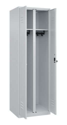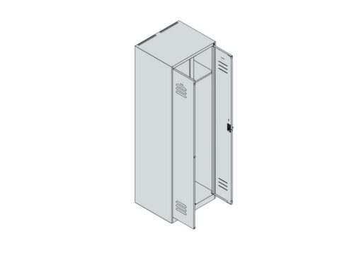 Die wichtigsten Maße des C+P Garderobenschranks Classic Plus auf einen Blick:Je Abteil ein festverschweißter Hutboden und darunter eine Kleiderstange mit 3 verdrehsicheren Doppelschiebehaken. Flügeltür mit Etikettenrahmen und Lüftungsschlitzen. Die innenliegenden Drehbolzen der einschlagenden Türen bieten den Vorteil einer sauberen Optik, da keine Schrauben oder Scharniere von außen sichtbar sind. Dadurch wird das Design des Schrankes nicht beeinträchtigt und das gesamte Möbelstück wirkt hochwertiger. Damit ist auch die glatte Oberfläche leichter zu reinigen, da keine Schmutz- oder Staubablagerungen an unzugänglichen Stellen zu befürchten sind. Jede Tür ist serienmäßig mit einer Anschlagsdämpfung ausgestattet, so dass, auch durch ein schwungvolles Schließen, die Tür nicht zuknallt. Das trägt nicht nur zu einer angenehmeren Geräuschkulisse bei, sondern schont auch den Stahlschrank vor Beschädigungen. Von der Natur inspiriert schafft der BIONIC Steel Frame eine besonders effiziente und stabile Konstruktion. Durch eine raffinierte innere Struktur aus Faltungen, Streben und Zwischenräumen, sowie höhere Materialstärke an entscheidenden Stellen, wie z. B. im vorderen Bereich der Seitenwände und in den Trennwand- und Kastenprofilen, wird die Verwindungssteifigkeit zusätzlich erhöht. Verschließbar mit Sicherheits-Drehriegel für Vorhängeschloss. Das Sicherheitsschloss ist besonders aufbruchsicher, da es im verschlossenen Zustand durchdreht und erst nach Entfernung des Schlosses einrastet. Passend für alle Vorhängeschlösser mit einer Bügelstärke von 6 - 8 mm. Pro Person stehen 2 Abteile zur Verfügung, die über die zueinander schlagenden Türen gemeinsam verschließbar sind. Dadurch ist eine strikte und saubere Trennung von Arbeits- und Alltagskleidung ganz einfach möglich. Die zusätzlichen Lüftungsöffnungen im Abteil, kombiniert mit den Lüftungsschlitzen in der Tür, verbessern den Luftstrom. Dadurch wird der Schrankinhalt besser belüftet und trocknet schneller, ohne unangenehme Gerüche zu verursachen. Für eine besonders schlanke und raumsparende Optik steht der Schrank ohne Sockel oder Füße direkt auf dem Boden. Lediglich Bodenausgleichsschrauben sorgen für einen wackelfreien Stand bei eventuellen Bodenunebenheiten. Der Schrankboden ist für einen erhöhten Korrosionsschutz zusätzlich verzinkt. Konstruktion aus Stahl, stabil verschweißt. Das macht die Konstruktion besonders robust und widerstandsfähig und somit langlebiger. Die verschweißten Ecken und Kanten des Korpus gewährleisten eine höhere Dichtigkeit und somit eine bessere Schutzfunktion gegen Staub, Feuchtigkeit und Schmutz als eine geschraubte Konstruktion. Zudem sind keine regelmäßigen Wartungsarbeiten und Nachjustierungen nötig. Korpus mit Einbrennlackierung in RAL7035 Lichtgrau, Front mit Einbrennlackierung in RAL7035 Lichtgrau.