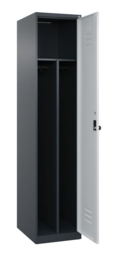Die wichtigsten Maße des C+P Garderobenschranks Classic Plus auf einen Blick:Je Abteil ein festverschweißter Hutboden und darunter eine Kleiderstange mit 3 verdrehsicheren Doppelschiebehaken. Das Abteil wird unter dem Hutboden durch eine Mitteltrennwand unterteilt. Dadurch ist eine saubere Schwarz-Weiß-Trennung von Arbeits- und Alltagskleidung möglich. Flügeltür mit Etikettenrahmen und Lüftungsschlitzen. Die innenliegenden Drehbolzen der einschlagenden Türen bieten den Vorteil einer sauberen Optik, da keine Schrauben oder Scharniere von außen sichtbar sind. Dadurch wird das Design des Schrankes nicht beeinträchtigt und das gesamte Möbelstück wirkt hochwertiger. Damit ist auch die glatte Oberfläche leichter zu reinigen, da keine Schmutz- oder Staubablagerungen an unzugänglichen Stellen zu befürchten sind. Jede Tür ist serienmäßig mit einer Anschlagsdämpfung ausgestattet, so dass, auch durch ein schwungvolles Schließen, die Tür nicht zuknallt. Das trägt nicht nur zu einer angenehmeren Geräuschkulisse bei, sondern schont auch den Stahlschrank vor Beschädigungen. Von der Natur inspiriert schafft der BIONIC Steel Frame eine besonders effiziente und stabile Konstruktion. Durch eine raffinierte innere Struktur aus Faltungen, Streben und Zwischenräumen, sowie höhere Materialstärke an entscheidenden Stellen, wie z. B. im vorderen Bereich der Seitenwände und in den Trennwand- und Kastenprofilen, wird die Verwindungssteifigkeit zusätzlich erhöht. Verschließbar mit Sicherheits-Drehriegel für Vorhängeschloss. Das Sicherheitsschloss ist besonders aufbruchsicher, da es im verschlossenen Zustand durchdreht und erst nach Entfernung des Schlosses einrastet. Passend für alle Vorhängeschlösser mit einer Bügelstärke von 6 - 8 mm. Die zusätzlichen Lüftungsöffnungen im Abteil, kombiniert mit den Lüftungsschlitzen in der Tür, verbessern den Luftstrom. Dadurch wird der Schrankinhalt besser belüftet und trocknet schneller, ohne unangenehme Gerüche zu verursachen. Für eine besonders schlanke und raumsparende Optik steht der Schrank ohne Sockel oder Füße direkt auf dem Boden. Lediglich Bodenausgleichsschrauben sorgen für einen wackelfreien Stand bei eventuellen Bodenunebenheiten. Der Schrankboden ist für einen erhöhten Korrosionsschutz zusätzlich verzinkt. Konstruktion aus Stahl, stabil verschweißt. Das macht die Konstruktion besonders robust und widerstandsfähig und somit langlebiger. Die verschweißten Ecken und Kanten des Korpus gewährleisten eine höhere Dichtigkeit und somit eine bessere Schutzfunktion gegen Staub, Feuchtigkeit und Schmutz als eine geschraubte Konstruktion. Zudem sind keine regelmäßigen Wartungsarbeiten und Nachjustierungen nötig. Korpus mit Einbrennlackierung in RAL7016 Anthrazitgrau, Front mit Einbrennlackierung in RAL7035 Lichtgrau.
