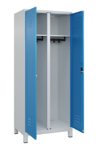 Die wichtigsten Maße des C+P Garderobenschranks Classic Plus auf einen Blick:Je Abteil ein festverschweißter Hutboden und darunter eine Kleiderstange mit 3 verdrehsicheren Doppelschiebehaken. Flügeltür mit Etikettenrahmen und Lüftungsschlitzen. Die innenliegenden Drehbolzen der einschlagenden Türen bieten den Vorteil einer sauberen Optik, da keine Schrauben oder Scharniere von außen sichtbar sind. Dadurch wird das Design des Schrankes nicht beeinträchtigt und das gesamte Möbelstück wirkt hochwertiger. Damit ist auch die glatte Oberfläche leichter zu reinigen, da keine Schmutz- oder Staubablagerungen an unzugänglichen Stellen zu befürchten sind. Jede Tür ist serienmäßig mit einer Anschlagsdämpfung ausgestattet, so dass, auch durch ein schwungvolles Schließen, die Tür nicht zuknallt. Das trägt nicht nur zu einer angenehmeren Geräuschkulisse bei, sondern schont auch den Stahlschrank vor Beschädigungen. Von der Natur inspiriert schafft der BIONIC Steel Frame eine besonders effiziente und stabile Konstruktion. Durch eine raffinierte innere Struktur aus Faltungen, Streben und Zwischenräumen, sowie höhere Materialstärke an entscheidenden Stellen, wie z. B. im vorderen Bereich der Seitenwände und in den Trennwand- und Kastenprofilen, wird die Verwindungssteifigkeit zusätzlich erhöht. Verschließbar mit Zylinderschloss. Pro Person stehen 2 Abteile zur Verfügung, die über die zueinander schlagenden Türen gemeinsam verschließbar sind. Dadurch ist eine strikte und saubere Trennung von Arbeits- und Alltagskleidung ganz einfach möglich. Die zusätzlichen Lüftungsöffnungen im Abteil, kombiniert mit den Lüftungsschlitzen in der Tür, verbessern den Luftstrom. Dadurch wird der Schrankinhalt besser belüftet und trocknet schneller, ohne unangenehme Gerüche zu verursachen. Die untergebauten Füße aus Kunststoff verleihen dem Schrank nicht nur ein modernes und leichtes Erscheinungsbild und lassen ihn weniger massiv wirken, sondern bieten auch praktische Vorteile. Der offene Raum über dem Boden erleichtert die Reinigung und das Material Kunststoff bietet einen erhöhten Korrosionsschutz. Gerade in Umgebungen mit höheren Hygieneansprüchen ist dies ein wichtiger Aspekt. Konstruktion aus Stahl, stabil verschweißt. Das macht die Konstruktion besonders robust und widerstandsfähig und somit langlebiger. Die verschweißten Ecken und Kanten des Korpus gewährleisten eine höhere Dichtigkeit und somit eine bessere Schutzfunktion gegen Staub, Feuchtigkeit und Schmutz als eine geschraubte Konstruktion. Zudem sind keine regelmäßigen Wartungsarbeiten und Nachjustierungen nötig. Korpus mit Einbrennlackierung in RAL7035 Lichtgrau, Front mit Einbrennlackierung in RAL5012 Lichtblau.