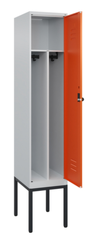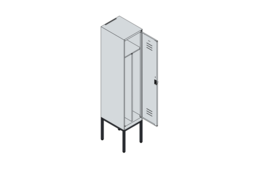Die wichtigsten Maße des C+P Garderobenschranks Classic Plus auf einen Blick:Je Abteil Hutboden, Kleiderstange, Haken. Das Abteil wird unter dem Hutboden durch eine Mitteltrennwand unterteilt. Dadurch ist eine saubere Schwarz-Weiß-Trennung von Arbeits- und Alltagskleidung möglich. Flügeltür mit Etikettenrahmen und Lüftungsschlitzen. Die innenliegenden Drehbolzen der einschlagenden Türen bieten den Vorteil einer sauberen Optik, da keine Schrauben oder Scharniere von außen sichtbar sind. Dadurch wird das Design des Schrankes nicht beeinträchtigt und das gesamte Möbelstück wirkt hochwertiger. Damit ist auch die glatte Oberfläche leichter zu reinigen, da keine Schmutz- oder Staubablagerungen an unzugänglichen Stellen zu befürchten sind. Jede Tür ist serienmäßig mit einer Anschlagsdämpfung ausgestattet, so dass, auch durch ein schwungvolles Schließen, die Tür nicht zuknallt. Das trägt nicht nur zu einer angenehmeren Geräuschkulisse bei, sondern schont auch den Stahlschrank vor Beschädigungen. Von der Natur inspiriert schafft der BIONIC Steel Frame eine besonders effiziente und stabile Konstruktion. Durch eine raffinierte innere Struktur aus Faltungen, Streben und Zwischenräumen, sowie höhere Materialstärke an entscheidenden Stellen, wie z. B. im vorderen Bereich der Seitenwände und in den Trennwand- und Kastenprofilen, wird die Verwindungssteifigkeit zusätzlich erhöht. Verschließbar mit Sicherheits-Drehriegel für Vorhängeschloss. Das Sicherheitsschloss ist besonders aufbruchsicher, da es im verschlossenen Zustand durchdreht und erst nach Entfernung des Schlosses einrastet. Passend für alle Vorhängeschlösser mit einer Bügelstärke von 6 - 8 mm. Die zusätzlichen Lüftungsöffnungen im Abteil, kombiniert mit den Lüftungsschlitzen in der Tür, verbessern den Luftstrom. Dadurch wird der Schrankinhalt besser belüftet und trocknet schneller, ohne unangenehme Gerüche zu verursachen. Das untergebaute Fußgestell reduziert mögliche Ansammlungen von Schmutz und Staub, da eine vollflächige Reinigung einfach möglich ist. Zudem wird zusätzlicher Stauraum unter dem Schrank geschaffen. Schuhe und Taschen stehen nicht mehr im Raum und stellen weniger Stolpergefahr dar. Konstruktion aus Stahl, stabil verschweißt. Das macht die Konstruktion besonders robust und widerstandsfähig und somit langlebiger. Die verschweißten Ecken und Kanten des Korpus gewährleisten eine höhere Dichtigkeit und somit eine bessere Schutzfunktion gegen Staub, Feuchtigkeit und Schmutz als eine geschraubte Konstruktion. Zudem sind keine regelmäßigen Wartungsarbeiten und Nachjustierungen nötig. Korpus mit Einbrennlackierung in RAL7035 Lichtgrau, Front mit Einbrennlackierung in RAL2004 Reinorange.