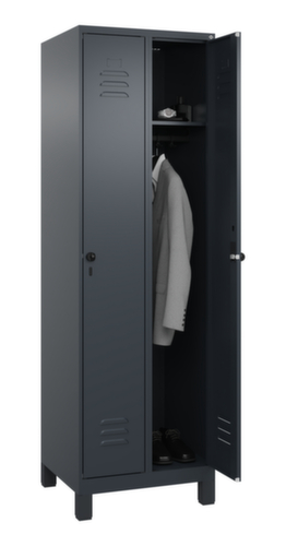 Die wichtigsten Maße des C+P Garderobenschranks Classic Plus auf einen Blick:Je Abteil ein festverschweißter Hutboden und darunter eine Kleiderstange mit 3 verdrehsicheren Doppelschiebehaken. Flügeltür mit Etikettenrahmen und Lüftungsschlitzen. Die innenliegenden Drehbolzen der einschlagenden Türen bieten den Vorteil einer sauberen Optik, da keine Schrauben oder Scharniere von außen sichtbar sind. Dadurch wird das Design des Schrankes nicht beeinträchtigt und das gesamte Möbelstück wirkt hochwertiger. Damit ist auch die glatte Oberfläche leichter zu reinigen, da keine Schmutz- oder Staubablagerungen an unzugänglichen Stellen zu befürchten sind. Jede Tür ist serienmäßig mit einer Anschlagsdämpfung ausgestattet, so dass, auch durch ein schwungvolles Schließen, die Tür nicht zuknallt. Das trägt nicht nur zu einer angenehmeren Geräuschkulisse bei, sondern schont auch den Stahlschrank vor Beschädigungen. Von der Natur inspiriert schafft der BIONIC Steel Frame eine besonders effiziente und stabile Konstruktion. Durch eine raffinierte innere Struktur aus Faltungen, Streben und Zwischenräumen, sowie höhere Materialstärke an entscheidenden Stellen, wie z. B. im vorderen Bereich der Seitenwände und in den Trennwand- und Kastenprofilen, wird die Verwindungssteifigkeit zusätzlich erhöht. Verschließbar mit Sicherheits-Drehriegel für Vorhängeschloss. Das Sicherheitsschloss ist besonders aufbruchsicher, da es im verschlossenen Zustand durchdreht und erst nach Entfernung des Schlosses einrastet. Passend für alle Vorhängeschlösser mit einer Bügelstärke von 6 - 8 mm. Die zusätzlichen Lüftungsöffnungen im Abteil, kombiniert mit den Lüftungsschlitzen in der Tür, verbessern den Luftstrom. Dadurch wird der Schrankinhalt besser belüftet und trocknet schneller, ohne unangenehme Gerüche zu verursachen. Die untergebauten Füße aus Kunststoff verleihen dem Schrank nicht nur ein modernes und leichtes Erscheinungsbild und lassen ihn weniger massiv wirken, sondern bieten auch praktische Vorteile. Der offene Raum über dem Boden erleichtert die Reinigung und das Material Kunststoff bietet einen erhöhten Korrosionsschutz. Gerade in Umgebungen mit höheren Hygieneansprüchen ist dies ein wichtiger Aspekt. Konstruktion aus Stahl, stabil verschweißt. Das macht die Konstruktion besonders robust und widerstandsfähig und somit langlebiger. Die verschweißten Ecken und Kanten des Korpus gewährleisten eine höhere Dichtigkeit und somit eine bessere Schutzfunktion gegen Staub, Feuchtigkeit und Schmutz als eine geschraubte Konstruktion. Zudem sind keine regelmäßigen Wartungsarbeiten und Nachjustierungen nötig. Korpus mit Einbrennlackierung in RAL7016 Anthrazitgrau, Front mit Einbrennlackierung in RAL7016 Anthrazitgrau.
