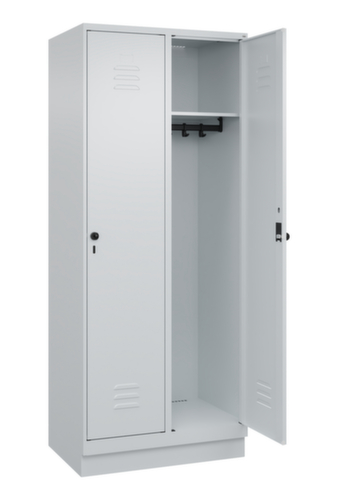 Die wichtigsten Maße des C+P Garderobenschranks Classic Plus auf einen Blick:Je Abteil ein festverschweißter Hutboden und darunter eine Kleiderstange mit 3 verdrehsicheren Doppelschiebehaken. Flügeltür mit Etikettenrahmen und Lüftungsschlitzen. Die innenliegenden Drehbolzen der einschlagenden Türen bieten den Vorteil einer sauberen Optik, da keine Schrauben oder Scharniere von außen sichtbar sind. Dadurch wird das Design des Schrankes nicht beeinträchtigt und das gesamte Möbelstück wirkt hochwertiger. Damit ist auch die glatte Oberfläche leichter zu reinigen, da keine Schmutz- oder Staubablagerungen an unzugänglichen Stellen zu befürchten sind. Jede Tür ist serienmäßig mit einer Anschlagsdämpfung ausgestattet, so dass, auch durch ein schwungvolles Schließen, die Tür nicht zuknallt. Das trägt nicht nur zu einer angenehmeren Geräuschkulisse bei, sondern schont auch den Stahlschrank vor Beschädigungen. Von der Natur inspiriert schafft der BIONIC Steel Frame eine besonders effiziente und stabile Konstruktion. Durch eine raffinierte innere Struktur aus Faltungen, Streben und Zwischenräumen, sowie höhere Materialstärke an entscheidenden Stellen, wie z. B. im vorderen Bereich der Seitenwände und in den Trennwand- und Kastenprofilen, wird die Verwindungssteifigkeit zusätzlich erhöht. Verschließbar mit Sicherheits-Drehriegel für Vorhängeschloss. Das Sicherheitsschloss ist besonders aufbruchsicher, da es im verschlossenen Zustand durchdreht und erst nach Entfernung des Schlosses einrastet. Passend für alle Vorhängeschlösser mit einer Bügelstärke von 6 - 8 mm. Die zusätzlichen Lüftungsöffnungen im Abteil, kombiniert mit den Lüftungsschlitzen in der Tür, verbessern den Luftstrom. Dadurch wird der Schrankinhalt besser belüftet und trocknet schneller, ohne unangenehme Gerüche zu verursachen. Der untergebaute Sockel sorgt dafür, dass das Gewicht des Schrankes gleichmäßig auf dem Boden verteilt wird. Dies erhöht die Stabilität und der Schrank kann schwerer Lasten aufnehmen, als ein Schrank mit Füßen. Außerdem können Schmutz, Staub und Feuchtigkeit nicht unter den Schrank gelangen, was die Reinigungsfläche verkleinert. Konstruktion aus Stahl, stabil verschweißt. Das macht die Konstruktion besonders robust und widerstandsfähig und somit langlebiger. Die verschweißten Ecken und Kanten des Korpus gewährleisten eine höhere Dichtigkeit und somit eine bessere Schutzfunktion gegen Staub, Feuchtigkeit und Schmutz als eine geschraubte Konstruktion. Zudem sind keine regelmäßigen Wartungsarbeiten und Nachjustierungen nötig. Korpus mit Einbrennlackierung in RAL7035 Lichtgrau, Front mit Einbrennlackierung in RAL7035 Lichtgrau.