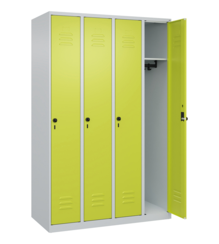 Die wichtigsten Maße des C+P Garderobenschranks Classic Plus auf einen Blick:Je Abteil ein festverschweißter Hutboden und darunter eine Kleiderstange mit 3 verdrehsicheren Doppelschiebehaken. Flügeltür mit Etikettenrahmen und Lüftungsschlitzen. Die innenliegenden Drehbolzen der einschlagenden Türen bieten den Vorteil einer sauberen Optik, da keine Schrauben oder Scharniere von außen sichtbar sind. Dadurch wird das Design des Schrankes nicht beeinträchtigt und das gesamte Möbelstück wirkt hochwertiger. Damit ist auch die glatte Oberfläche leichter zu reinigen, da keine Schmutz- oder Staubablagerungen an unzugänglichen Stellen zu befürchten sind. Jede Tür ist serienmäßig mit einer Anschlagsdämpfung ausgestattet, so dass, auch durch ein schwungvolles Schließen, die Tür nicht zuknallt. Das trägt nicht nur zu einer angenehmeren Geräuschkulisse bei, sondern schont auch den Stahlschrank vor Beschädigungen. Von der Natur inspiriert schafft der BIONIC Steel Frame eine besonders effiziente und stabile Konstruktion. Durch eine raffinierte innere Struktur aus Faltungen, Streben und Zwischenräumen, sowie höhere Materialstärke an entscheidenden Stellen, wie z. B. im vorderen Bereich der Seitenwände und in den Trennwand- und Kastenprofilen, wird die Verwindungssteifigkeit zusätzlich erhöht. Verschließbar mit Sicherheits-Drehriegel für Vorhängeschloss. Das Sicherheitsschloss ist besonders aufbruchsicher, da es im verschlossenen Zustand durchdreht und erst nach Entfernung des Schlosses einrastet. Passend für alle Vorhängeschlösser mit einer Bügelstärke von 6 - 8 mm. Die zusätzlichen Lüftungsöffnungen im Abteil, kombiniert mit den Lüftungsschlitzen in der Tür, verbessern den Luftstrom. Dadurch wird der Schrankinhalt besser belüftet und trocknet schneller, ohne unangenehme Gerüche zu verursachen. Für eine besonders schlanke und raumsparende Optik steht der Schrank ohne Sockel oder Füße direkt auf dem Boden. Lediglich Bodenausgleichsschrauben sorgen für einen wackelfreien Stand bei eventuellen Bodenunebenheiten. Der Schrankboden ist für einen erhöhten Korrosionsschutz zusätzlich verzinkt. Konstruktion aus Stahl, stabil verschweißt. Das macht die Konstruktion besonders robust und widerstandsfähig und somit langlebiger. Die verschweißten Ecken und Kanten des Korpus gewährleisten eine höhere Dichtigkeit und somit eine bessere Schutzfunktion gegen Staub, Feuchtigkeit und Schmutz als eine geschraubte Konstruktion. Zudem sind keine regelmäßigen Wartungsarbeiten und Nachjustierungen nötig. Korpus mit Einbrennlackierung in RAL7035 Lichtgrau, Front mit Einbrennlackierung in RDS 110 80 60 Viridingrün.