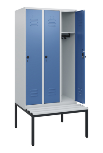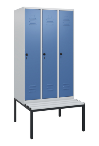 Die wichtigsten Maße des C+P Garderobenschranks Classic Plus auf einen Blick:Je Abteil ein festverschweißter Hutboden und darunter eine Kleiderstange mit 3 verdrehsicheren Doppelschiebehaken. Flügeltür mit Etikettenrahmen und Lüftungsschlitzen. Die innenliegenden Drehbolzen der einschlagenden Türen bieten den Vorteil einer sauberen Optik, da keine Schrauben oder Scharniere von außen sichtbar sind. Dadurch wird das Design des Schrankes nicht beeinträchtigt und das gesamte Möbelstück wirkt hochwertiger. Damit ist auch die glatte Oberfläche leichter zu reinigen, da keine Schmutz- oder Staubablagerungen an unzugänglichen Stellen zu befürchten sind. Jede Tür ist serienmäßig mit einer Anschlagsdämpfung ausgestattet, so dass, auch durch ein schwungvolles Schließen, die Tür nicht zuknallt. Das trägt nicht nur zu einer angenehmeren Geräuschkulisse bei, sondern schont auch den Stahlschrank vor Beschädigungen. Von der Natur inspiriert schafft der BIONIC Steel Frame eine besonders effiziente und stabile Konstruktion. Durch eine raffinierte innere Struktur aus Faltungen, Streben und Zwischenräumen, sowie höhere Materialstärke an entscheidenden Stellen, wie z. B. im vorderen Bereich der Seitenwände und in den Trennwand- und Kastenprofilen, wird die Verwindungssteifigkeit zusätzlich erhöht. Verschließbar mit Sicherheits-Drehriegel für Vorhängeschloss. Das Sicherheitsschloss ist besonders aufbruchsicher, da es im verschlossenen Zustand durchdreht und erst nach Entfernung des Schlosses einrastet. Passend für alle Vorhängeschlösser mit einer Bügelstärke von 6 - 8 mm. Die zusätzlichen Lüftungsöffnungen im Abteil, kombiniert mit den Lüftungsschlitzen in der Tür, verbessern den Luftstrom. Dadurch wird der Schrankinhalt besser belüftet und trocknet schneller, ohne unangenehme Gerüche zu verursachen. Die untergebaute Sitzbank sorgt für eine effiziente Nutzung des verfügbaren Raumes. Sie ermöglicht ein bequemes An- und Ausziehen und bietet direkt noch Stauraum, ohne zusätzlichen Platz zu beanspruchen. Die Leisten sind aus Kunststoff. Konstruktion aus Stahl, stabil verschweißt. Das macht die Konstruktion besonders robust und widerstandsfähig und somit langlebiger. Die verschweißten Ecken und Kanten des Korpus gewährleisten eine höhere Dichtigkeit und somit eine bessere Schutzfunktion gegen Staub, Feuchtigkeit und Schmutz als eine geschraubte Konstruktion. Zudem sind keine regelmäßigen Wartungsarbeiten und Nachjustierungen nötig. Korpus mit Einbrennlackierung in RAL7035 Lichtgrau, Front mit Einbrennlackierung in RAL5023 Fernblau.