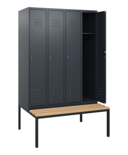 Die wichtigsten Maße des C+P Garderobenschranks Classic Plus auf einen Blick:Je Abteil ein festverschweißter Hutboden und darunter eine Kleiderstange mit 3 verdrehsicheren Doppelschiebehaken. Flügeltür mit Etikettenrahmen und Lüftungsschlitzen. Die innenliegenden Drehbolzen der einschlagenden Türen bieten den Vorteil einer sauberen Optik, da keine Schrauben oder Scharniere von außen sichtbar sind. Dadurch wird das Design des Schrankes nicht beeinträchtigt und das gesamte Möbelstück wirkt hochwertiger. Damit ist auch die glatte Oberfläche leichter zu reinigen, da keine Schmutz- oder Staubablagerungen an unzugänglichen Stellen zu befürchten sind. Jede Tür ist serienmäßig mit einer Anschlagsdämpfung ausgestattet, so dass, auch durch ein schwungvolles Schließen, die Tür nicht zuknallt. Das trägt nicht nur zu einer angenehmeren Geräuschkulisse bei, sondern schont auch den Stahlschrank vor Beschädigungen. Von der Natur inspiriert schafft der BIONIC Steel Frame eine besonders effiziente und stabile Konstruktion. Durch eine raffinierte innere Struktur aus Faltungen, Streben und Zwischenräumen, sowie höhere Materialstärke an entscheidenden Stellen, wie z. B. im vorderen Bereich der Seitenwände und in den Trennwand- und Kastenprofilen, wird die Verwindungssteifigkeit zusätzlich erhöht. Verschließbar mit Zylinderschloss. Die zusätzlichen Lüftungsöffnungen im Abteil, kombiniert mit den Lüftungsschlitzen in der Tür, verbessern den Luftstrom. Dadurch wird der Schrankinhalt besser belüftet und trocknet schneller, ohne unangenehme Gerüche zu verursachen. Die untergebaute Sitzbank sorgt für eine effiziente Nutzung des verfügbaren Raumes. Sie ermöglicht ein bequemes An- und Ausziehen und bietet direkt noch Stauraum, ohne zusätzlichen Platz zu beanspruchen. Die Leisten sind aus Buchenholz. Konstruktion aus Stahl, stabil verschweißt. Das macht die Konstruktion besonders robust und widerstandsfähig und somit langlebiger. Die verschweißten Ecken und Kanten des Korpus gewährleisten eine höhere Dichtigkeit und somit eine bessere Schutzfunktion gegen Staub, Feuchtigkeit und Schmutz als eine geschraubte Konstruktion. Zudem sind keine regelmäßigen Wartungsarbeiten und Nachjustierungen nötig. Korpus mit Einbrennlackierung in RAL7016 Anthrazitgrau, Front mit Einbrennlackierung in RAL7016 Anthrazitgrau.