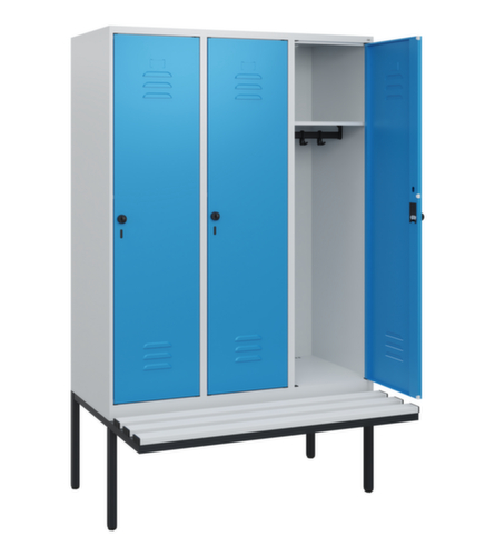 Die wichtigsten Maße des C+P Garderobenschranks Classic Plus auf einen Blick:Je Abteil ein festverschweißter Hutboden und darunter eine Kleiderstange mit 3 verdrehsicheren Doppelschiebehaken. Flügeltür mit Etikettenrahmen und Lüftungsschlitzen. Die innenliegenden Drehbolzen der einschlagenden Türen bieten den Vorteil einer sauberen Optik, da keine Schrauben oder Scharniere von außen sichtbar sind. Dadurch wird das Design des Schrankes nicht beeinträchtigt und das gesamte Möbelstück wirkt hochwertiger. Damit ist auch die glatte Oberfläche leichter zu reinigen, da keine Schmutz- oder Staubablagerungen an unzugänglichen Stellen zu befürchten sind. Jede Tür ist serienmäßig mit einer Anschlagsdämpfung ausgestattet, so dass, auch durch ein schwungvolles Schließen, die Tür nicht zuknallt. Das trägt nicht nur zu einer angenehmeren Geräuschkulisse bei, sondern schont auch den Stahlschrank vor Beschädigungen. Von der Natur inspiriert schafft der BIONIC Steel Frame eine besonders effiziente und stabile Konstruktion. Durch eine raffinierte innere Struktur aus Faltungen, Streben und Zwischenräumen, sowie höhere Materialstärke an entscheidenden Stellen, wie z. B. im vorderen Bereich der Seitenwände und in den Trennwand- und Kastenprofilen, wird die Verwindungssteifigkeit zusätzlich erhöht. Verschließbar mit Sicherheits-Drehriegel für Vorhängeschloss. Das Sicherheitsschloss ist besonders aufbruchsicher, da es im verschlossenen Zustand durchdreht und erst nach Entfernung des Schlosses einrastet. Passend für alle Vorhängeschlösser mit einer Bügelstärke von 6 - 8 mm. Die zusätzlichen Lüftungsöffnungen im Abteil, kombiniert mit den Lüftungsschlitzen in der Tür, verbessern den Luftstrom. Dadurch wird der Schrankinhalt besser belüftet und trocknet schneller, ohne unangenehme Gerüche zu verursachen. Die schwebende Sitzbank bietet mehr Freiraum für ein bequemes An- und Ausziehen, ohne dass die Füße des Gestells im Weg sind. Die Leisten sind aus Kunststoff. Das untergebaute Fußgestell reduziert mögliche Ansammlungen von Schmutz und Staub, da eine vollflächige Reinigung einfach möglich ist. Zudem wird zusätzlicher Stauraum unter dem Schrank geschaffen. Schuhe und Taschen stehen nicht mehr im Raum und stellen weniger Stolpergefahr dar. Konstruktion aus Stahl, stabil verschweißt. Das macht die Konstruktion besonders robust und widerstandsfähig und somit langlebiger. Die verschweißten Ecken und Kanten des Korpus gewährleisten eine höhere Dichtigkeit und somit eine bessere Schutzfunktion gegen Staub, Feuchtigkeit und Schmutz als eine geschraubte Konstruktion. Zudem sind keine regelmäßigen Wartungsarbeiten und Nachjustierungen nötig. Korpus mit Einbrennlackierung in RAL7035 Lichtgrau, Front mit Einbrennlackierung in RAL5012 Lichtblau.