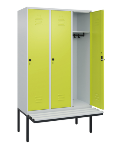 Die wichtigsten Maße des C+P Garderobenschranks Classic Plus auf einen Blick:Je Abteil ein festverschweißter Hutboden und darunter eine Kleiderstange mit 3 verdrehsicheren Doppelschiebehaken. Flügeltür mit Etikettenrahmen und Lüftungsschlitzen. Die innenliegenden Drehbolzen der einschlagenden Türen bieten den Vorteil einer sauberen Optik, da keine Schrauben oder Scharniere von außen sichtbar sind. Dadurch wird das Design des Schrankes nicht beeinträchtigt und das gesamte Möbelstück wirkt hochwertiger. Damit ist auch die glatte Oberfläche leichter zu reinigen, da keine Schmutz- oder Staubablagerungen an unzugänglichen Stellen zu befürchten sind. Jede Tür ist serienmäßig mit einer Anschlagsdämpfung ausgestattet, so dass, auch durch ein schwungvolles Schließen, die Tür nicht zuknallt. Das trägt nicht nur zu einer angenehmeren Geräuschkulisse bei, sondern schont auch den Stahlschrank vor Beschädigungen. Von der Natur inspiriert schafft der BIONIC Steel Frame eine besonders effiziente und stabile Konstruktion. Durch eine raffinierte innere Struktur aus Faltungen, Streben und Zwischenräumen, sowie höhere Materialstärke an entscheidenden Stellen, wie z. B. im vorderen Bereich der Seitenwände und in den Trennwand- und Kastenprofilen, wird die Verwindungssteifigkeit zusätzlich erhöht. Verschließbar mit Sicherheits-Drehriegel für Vorhängeschloss. Das Sicherheitsschloss ist besonders aufbruchsicher, da es im verschlossenen Zustand durchdreht und erst nach Entfernung des Schlosses einrastet. Passend für alle Vorhängeschlösser mit einer Bügelstärke von 6 - 8 mm. Die zusätzlichen Lüftungsöffnungen im Abteil, kombiniert mit den Lüftungsschlitzen in der Tür, verbessern den Luftstrom. Dadurch wird der Schrankinhalt besser belüftet und trocknet schneller, ohne unangenehme Gerüche zu verursachen. Die schwebende Sitzbank bietet mehr Freiraum für ein bequemes An- und Ausziehen, ohne dass die Füße des Gestells im Weg sind. Die Leisten sind aus Kunststoff. Das untergebaute Fußgestell reduziert mögliche Ansammlungen von Schmutz und Staub, da eine vollflächige Reinigung einfach möglich ist. Zudem wird zusätzlicher Stauraum unter dem Schrank geschaffen. Schuhe und Taschen stehen nicht mehr im Raum und stellen weniger Stolpergefahr dar. Konstruktion aus Stahl, stabil verschweißt. Das macht die Konstruktion besonders robust und widerstandsfähig und somit langlebiger. Die verschweißten Ecken und Kanten des Korpus gewährleisten eine höhere Dichtigkeit und somit eine bessere Schutzfunktion gegen Staub, Feuchtigkeit und Schmutz als eine geschraubte Konstruktion. Zudem sind keine regelmäßigen Wartungsarbeiten und Nachjustierungen nötig. Korpus mit Einbrennlackierung in RAL7035 Lichtgrau, Front mit Einbrennlackierung in RDS 110 80 60 Viridingrün.