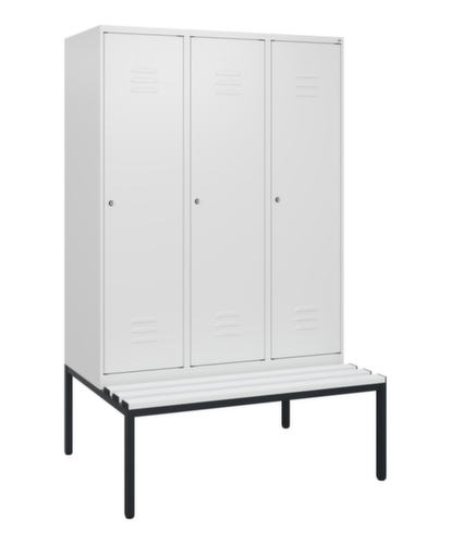 Die wichtigsten Maße des C+P Garderobenschranks Classic Plus auf einen Blick:Je Abteil ein festverschweißter Hutboden und darunter eine Kleiderstange mit 3 verdrehsicheren Doppelschiebehaken. Flügeltür mit Etikettenrahmen und Lüftungsschlitzen. Die innenliegenden Drehbolzen der einschlagenden Türen bieten den Vorteil einer sauberen Optik, da keine Schrauben oder Scharniere von außen sichtbar sind. Dadurch wird das Design des Schrankes nicht beeinträchtigt und das gesamte Möbelstück wirkt hochwertiger. Damit ist auch die glatte Oberfläche leichter zu reinigen, da keine Schmutz- oder Staubablagerungen an unzugänglichen Stellen zu befürchten sind. Jede Tür ist serienmäßig mit einer Anschlagsdämpfung ausgestattet, so dass, auch durch ein schwungvolles Schließen, die Tür nicht zuknallt. Das trägt nicht nur zu einer angenehmeren Geräuschkulisse bei, sondern schont auch den Stahlschrank vor Beschädigungen. Von der Natur inspiriert schafft der BIONIC Steel Frame eine besonders effiziente und stabile Konstruktion. Durch eine raffinierte innere Struktur aus Faltungen, Streben und Zwischenräumen, sowie höhere Materialstärke an entscheidenden Stellen, wie z. B. im vorderen Bereich der Seitenwände und in den Trennwand- und Kastenprofilen, wird die Verwindungssteifigkeit zusätzlich erhöht. Verschließbar mit Zylinderschloss. Die zusätzlichen Lüftungsöffnungen im Abteil, kombiniert mit den Lüftungsschlitzen in der Tür, verbessern den Luftstrom. Dadurch wird der Schrankinhalt besser belüftet und trocknet schneller, ohne unangenehme Gerüche zu verursachen. Die untergebaute Sitzbank sorgt für eine effiziente Nutzung des verfügbaren Raumes. Sie ermöglicht ein bequemes An- und Ausziehen und bietet direkt noch Stauraum, ohne zusätzlichen Platz zu beanspruchen. Die Leisten sind aus Kunststoff. Konstruktion aus Stahl, stabil verschweißt. Das macht die Konstruktion besonders robust und widerstandsfähig und somit langlebiger. Die verschweißten Ecken und Kanten des Korpus gewährleisten eine höhere Dichtigkeit und somit eine bessere Schutzfunktion gegen Staub, Feuchtigkeit und Schmutz als eine geschraubte Konstruktion. Zudem sind keine regelmäßigen Wartungsarbeiten und Nachjustierungen nötig. Korpus mit Einbrennlackierung in RAL9016 Verkehrsweiß, Front mit Einbrennlackierung in RAL9016 Verkehrsweiß.