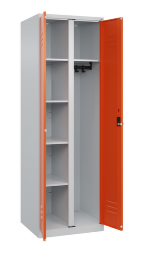 Die wichtigsten Maße des C+P Wäscheschranks Classic Plus auf einen Blick:Links ausgestattet mit 5 Fächer, rechts mit 1 Hutboden und Kleiderstange mit 3 Haken. Doppel-Flügeltür mit Lüftungsschlitzen und Etikettenrahmen. Die innenliegenden Drehbolzen der einschlagenden Türen bieten den Vorteil einer sauberen Optik, da keine Schrauben oder Scharniere von außen sichtbar sind. Dadurch wird das Design des Schrankes nicht beeinträchtigt und das gesamte Möbelstück wirkt hochwertiger. Damit ist auch die glatte Oberfläche leichter zu reinigen, da keine Schmutz- oder Staubablagerungen an unzugänglichen Stellen zu befürchten sind. Jede Tür ist serienmäßig mit einer Anschlagsdämpfung ausgestattet, so dass, auch durch ein schwungvolles Schließen, die Tür nicht zuknallt. Das trägt nicht nur zu einer angenehmeren Geräuschkulisse bei, sondern schont auch den Stahlschrank vor Beschädigungen. Von der Natur inspiriert schafft der BIONIC Steel Frame eine besonders effiziente und stabile Konstruktion. Durch eine raffinierte innere Struktur aus Faltungen, Streben und Zwischenräumen, sowie höhere Materialstärke an entscheidenden Stellen, wie z. B. im vorderen Bereich der Seitenwände und in den Trennwand- und Kastenprofilen, wird die Verwindungssteifigkeit zusätzlich erhöht. Verschließbar mit Sicherheits-Drehriegel für Vorhängeschloss. Das Sicherheitsschloss ist besonders aufbruchsicher, da es im verschlossenen Zustand durchdreht und erst nach Entfernung des Schlosses einrastet. Passend für alle Vorhängeschlösser mit einer Bügelstärke von 6 - 8 mm. Die zusätzlichen Lüftungsöffnungen im Abteil, kombiniert mit den Lüftungsschlitzen in der Tür, verbessern den Luftstrom. Dadurch wird der Schrankinhalt besser belüftet und trocknet schneller, ohne unangenehme Gerüche zu verursachen. Für eine besonders schlanke und raumsparende Optik steht der Schrank ohne Sockel oder Füße direkt auf dem Boden. Lediglich Bodenausgleichsschrauben sorgen für einen wackelfreien Stand bei eventuellen Bodenunebenheiten. Der Schrankboden ist für einen erhöhten Korrosionsschutz zusätzlich verzinkt. Konstruktion aus Stahl, stabil verschweißt. Das macht die Konstruktion besonders robust und widerstandsfähig und somit langlebiger. Die verschweißten Ecken und Kanten des Korpus gewährleisten eine höhere Dichtigkeit und somit eine bessere Schutzfunktion gegen Staub, Feuchtigkeit und Schmutz als eine geschraubte Konstruktion. Zudem sind keine regelmäßigen Wartungsarbeiten und Nachjustierungen nötig. Korpus mit Einbrennlackierung in RAL7035 Lichtgrau, Front mit Einbrennlackierung in RAL2004 Reinorange.