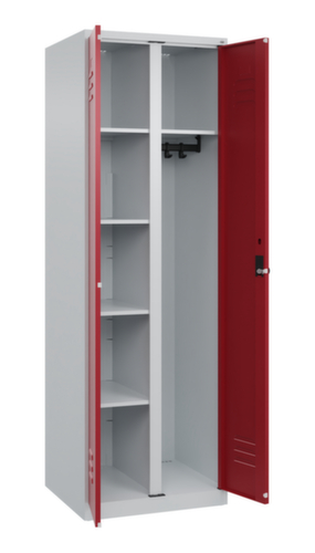 Die wichtigsten Maße des C+P Wäscheschranks Classic Plus auf einen Blick:Links ausgestattet mit 5 Fächer, rechts mit 1 Hutboden und Kleiderstange mit 3 Haken. Doppel-Flügeltür mit Lüftungsschlitzen und Etikettenrahmen. Die innenliegenden Drehbolzen der einschlagenden Türen bieten den Vorteil einer sauberen Optik, da keine Schrauben oder Scharniere von außen sichtbar sind. Dadurch wird das Design des Schrankes nicht beeinträchtigt und das gesamte Möbelstück wirkt hochwertiger. Damit ist auch die glatte Oberfläche leichter zu reinigen, da keine Schmutz- oder Staubablagerungen an unzugänglichen Stellen zu befürchten sind. Jede Tür ist serienmäßig mit einer Anschlagsdämpfung ausgestattet, so dass, auch durch ein schwungvolles Schließen, die Tür nicht zuknallt. Das trägt nicht nur zu einer angenehmeren Geräuschkulisse bei, sondern schont auch den Stahlschrank vor Beschädigungen. Von der Natur inspiriert schafft der BIONIC Steel Frame eine besonders effiziente und stabile Konstruktion. Durch eine raffinierte innere Struktur aus Faltungen, Streben und Zwischenräumen, sowie höhere Materialstärke an entscheidenden Stellen, wie z. B. im vorderen Bereich der Seitenwände und in den Trennwand- und Kastenprofilen, wird die Verwindungssteifigkeit zusätzlich erhöht. Verschließbar mit Sicherheits-Drehriegel für Vorhängeschloss. Das Sicherheitsschloss ist besonders aufbruchsicher, da es im verschlossenen Zustand durchdreht und erst nach Entfernung des Schlosses einrastet. Passend für alle Vorhängeschlösser mit einer Bügelstärke von 6 - 8 mm. Die zusätzlichen Lüftungsöffnungen im Abteil, kombiniert mit den Lüftungsschlitzen in der Tür, verbessern den Luftstrom. Dadurch wird der Schrankinhalt besser belüftet und trocknet schneller, ohne unangenehme Gerüche zu verursachen. Für eine besonders schlanke und raumsparende Optik steht der Schrank ohne Sockel oder Füße direkt auf dem Boden. Lediglich Bodenausgleichsschrauben sorgen für einen wackelfreien Stand bei eventuellen Bodenunebenheiten. Der Schrankboden ist für einen erhöhten Korrosionsschutz zusätzlich verzinkt. Konstruktion aus Stahl, stabil verschweißt. Das macht die Konstruktion besonders robust und widerstandsfähig und somit langlebiger. Die verschweißten Ecken und Kanten des Korpus gewährleisten eine höhere Dichtigkeit und somit eine bessere Schutzfunktion gegen Staub, Feuchtigkeit und Schmutz als eine geschraubte Konstruktion. Zudem sind keine regelmäßigen Wartungsarbeiten und Nachjustierungen nötig. Korpus mit Einbrennlackierung in RAL7035 Lichtgrau, Front mit Einbrennlackierung in RAL3003 Rubinrot.