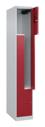 Die wichtigsten Maße des C+P Garderobenschranks Classic Plus auf einen Blick:Je Abteil eine Kleiderstange mit 3 verdrehsicheren Doppelschiebehaken. Flügeltür mit Etikettenrahmen und Lüftungsschlitzen. Die innenliegenden Drehbolzen der einschlagenden Türen bieten den Vorteil einer sauberen Optik, da keine Schrauben oder Scharniere von außen sichtbar sind. Dadurch wird das Design des Schrankes nicht beeinträchtigt und das gesamte Möbelstück wirkt hochwertiger. Damit ist auch die glatte Oberfläche leichter zu reinigen, da keine Schmutz- oder Staubablagerungen an unzugänglichen Stellen zu befürchten sind. Jede Tür ist serienmäßig mit einer Anschlagsdämpfung ausgestattet, so dass, auch durch ein schwungvolles Schließen, die Tür nicht zuknallt. Das trägt nicht nur zu einer angenehmeren Geräuschkulisse bei, sondern schont auch den Stahlschrank vor Beschädigungen. Von der Natur inspiriert schafft der BIONIC Steel Frame eine besonders effiziente und stabile Konstruktion. Durch eine raffinierte innere Struktur aus Faltungen, Streben und Zwischenräumen, sowie höhere Materialstärke an entscheidenden Stellen, wie z. B. im vorderen Bereich der Seitenwände und in den Trennwand- und Kastenprofilen, wird die Verwindungssteifigkeit zusätzlich erhöht. Verschließbar mit Zylinderschloss. Die zusätzlichen Lüftungsöffnungen im Abteil, kombiniert mit den Lüftungsschlitzen in der Tür, verbessern den Luftstrom. Dadurch wird der Schrankinhalt besser belüftet und trocknet schneller, ohne unangenehme Gerüche zu verursachen. Für eine besonders schlanke und raumsparende Optik steht der Schrank ohne Sockel oder Füße direkt auf dem Boden. Lediglich Bodenausgleichsschrauben sorgen für einen wackelfreien Stand bei eventuellen Bodenunebenheiten. Der Schrankboden ist für einen erhöhten Korrosionsschutz zusätzlich verzinkt. Konstruktion aus Stahl, stabil verschweißt. Das macht die Konstruktion besonders robust und widerstandsfähig und somit langlebiger. Die verschweißten Ecken und Kanten des Korpus gewährleisten eine höhere Dichtigkeit und somit eine bessere Schutzfunktion gegen Staub, Feuchtigkeit und Schmutz als eine geschraubte Konstruktion. Zudem sind keine regelmäßigen Wartungsarbeiten und Nachjustierungen nötig. Korpus mit Einbrennlackierung in RAL7035 Lichtgrau, Front mit Einbrennlackierung in RAL3003 Rubinrot.