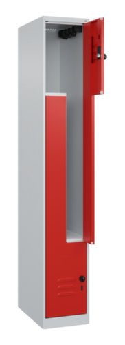 Die wichtigsten Maße des C+P Garderobenschranks Classic Plus auf einen Blick:Je Abteil eine Kleiderstange mit 3 verdrehsicheren Doppelschiebehaken. Flügeltür mit Etikettenrahmen und Lüftungsschlitzen. Die innenliegenden Drehbolzen der einschlagenden Türen bieten den Vorteil einer sauberen Optik, da keine Schrauben oder Scharniere von außen sichtbar sind. Dadurch wird das Design des Schrankes nicht beeinträchtigt und das gesamte Möbelstück wirkt hochwertiger. Damit ist auch die glatte Oberfläche leichter zu reinigen, da keine Schmutz- oder Staubablagerungen an unzugänglichen Stellen zu befürchten sind. Jede Tür ist serienmäßig mit einer Anschlagsdämpfung ausgestattet, so dass, auch durch ein schwungvolles Schließen, die Tür nicht zuknallt. Das trägt nicht nur zu einer angenehmeren Geräuschkulisse bei, sondern schont auch den Stahlschrank vor Beschädigungen. Von der Natur inspiriert schafft der BIONIC Steel Frame eine besonders effiziente und stabile Konstruktion. Durch eine raffinierte innere Struktur aus Faltungen, Streben und Zwischenräumen, sowie höhere Materialstärke an entscheidenden Stellen, wie z. B. im vorderen Bereich der Seitenwände und in den Trennwand- und Kastenprofilen, wird die Verwindungssteifigkeit zusätzlich erhöht. Verschließbar mit Sicherheits-Drehriegel für Vorhängeschloss. Das Sicherheitsschloss ist besonders aufbruchsicher, da es im verschlossenen Zustand durchdreht und erst nach Entfernung des Schlosses einrastet. Passend für alle Vorhängeschlösser mit einer Bügelstärke von 6 - 8 mm. Die zusätzlichen Lüftungsöffnungen im Abteil, kombiniert mit den Lüftungsschlitzen in der Tür, verbessern den Luftstrom. Dadurch wird der Schrankinhalt besser belüftet und trocknet schneller, ohne unangenehme Gerüche zu verursachen. Für eine besonders schlanke und raumsparende Optik steht der Schrank ohne Sockel oder Füße direkt auf dem Boden. Lediglich Bodenausgleichsschrauben sorgen für einen wackelfreien Stand bei eventuellen Bodenunebenheiten. Der Schrankboden ist für einen erhöhten Korrosionsschutz zusätzlich verzinkt. Konstruktion aus Stahl, stabil verschweißt. Das macht die Konstruktion besonders robust und widerstandsfähig und somit langlebiger. Die verschweißten Ecken und Kanten des Korpus gewährleisten eine höhere Dichtigkeit und somit eine bessere Schutzfunktion gegen Staub, Feuchtigkeit und Schmutz als eine geschraubte Konstruktion. Zudem sind keine regelmäßigen Wartungsarbeiten und Nachjustierungen nötig. Korpus mit Einbrennlackierung in RAL7035 Lichtgrau, Front mit Einbrennlackierung in RAL3020 Verkehrsrot.