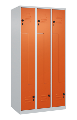 Die wichtigsten Maße des C+P Garderobenschranks Classic Plus auf einen Blick:Je Abteil eine Kleiderstange mit 3 verdrehsicheren Doppelschiebehaken. Flügeltür mit Etikettenrahmen und Lüftungsschlitzen. Die innenliegenden Drehbolzen der einschlagenden Türen bieten den Vorteil einer sauberen Optik, da keine Schrauben oder Scharniere von außen sichtbar sind. Dadurch wird das Design des Schrankes nicht beeinträchtigt und das gesamte Möbelstück wirkt hochwertiger. Damit ist auch die glatte Oberfläche leichter zu reinigen, da keine Schmutz- oder Staubablagerungen an unzugänglichen Stellen zu befürchten sind. Jede Tür ist serienmäßig mit einer Anschlagsdämpfung ausgestattet, so dass, auch durch ein schwungvolles Schließen, die Tür nicht zuknallt. Das trägt nicht nur zu einer angenehmeren Geräuschkulisse bei, sondern schont auch den Stahlschrank vor Beschädigungen. Von der Natur inspiriert schafft der BIONIC Steel Frame eine besonders effiziente und stabile Konstruktion. Durch eine raffinierte innere Struktur aus Faltungen, Streben und Zwischenräumen, sowie höhere Materialstärke an entscheidenden Stellen, wie z. B. im vorderen Bereich der Seitenwände und in den Trennwand- und Kastenprofilen, wird die Verwindungssteifigkeit zusätzlich erhöht. Verschließbar mit Sicherheits-Drehriegel für Vorhängeschloss. Das Sicherheitsschloss ist besonders aufbruchsicher, da es im verschlossenen Zustand durchdreht und erst nach Entfernung des Schlosses einrastet. Passend für alle Vorhängeschlösser mit einer Bügelstärke von 6 - 8 mm. Die zusätzlichen Lüftungsöffnungen im Abteil, kombiniert mit den Lüftungsschlitzen in der Tür, verbessern den Luftstrom. Dadurch wird der Schrankinhalt besser belüftet und trocknet schneller, ohne unangenehme Gerüche zu verursachen. Für eine besonders schlanke und raumsparende Optik steht der Schrank ohne Sockel oder Füße direkt auf dem Boden. Lediglich Bodenausgleichsschrauben sorgen für einen wackelfreien Stand bei eventuellen Bodenunebenheiten. Der Schrankboden ist für einen erhöhten Korrosionsschutz zusätzlich verzinkt. Konstruktion aus Stahl, stabil verschweißt. Das macht die Konstruktion besonders robust und widerstandsfähig und somit langlebiger. Die verschweißten Ecken und Kanten des Korpus gewährleisten eine höhere Dichtigkeit und somit eine bessere Schutzfunktion gegen Staub, Feuchtigkeit und Schmutz als eine geschraubte Konstruktion. Zudem sind keine regelmäßigen Wartungsarbeiten und Nachjustierungen nötig. Korpus mit Einbrennlackierung in RAL7035 Lichtgrau, Front mit Einbrennlackierung in RAL2004 Reinorange.