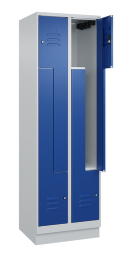 Die wichtigsten Maße des C+P Garderobenschranks Classic Plus auf einen Blick:Je Abteil eine Kleiderstange mit 3 verdrehsicheren Doppelschiebehaken. Flügeltür mit Etikettenrahmen und Lüftungsschlitzen. Die innenliegenden Drehbolzen der einschlagenden Türen bieten den Vorteil einer sauberen Optik, da keine Schrauben oder Scharniere von außen sichtbar sind. Dadurch wird das Design des Schrankes nicht beeinträchtigt und das gesamte Möbelstück wirkt hochwertiger. Damit ist auch die glatte Oberfläche leichter zu reinigen, da keine Schmutz- oder Staubablagerungen an unzugänglichen Stellen zu befürchten sind. Jede Tür ist serienmäßig mit einer Anschlagsdämpfung ausgestattet, so dass, auch durch ein schwungvolles Schließen, die Tür nicht zuknallt. Das trägt nicht nur zu einer angenehmeren Geräuschkulisse bei, sondern schont auch den Stahlschrank vor Beschädigungen. Von der Natur inspiriert schafft der BIONIC Steel Frame eine besonders effiziente und stabile Konstruktion. Durch eine raffinierte innere Struktur aus Faltungen, Streben und Zwischenräumen, sowie höhere Materialstärke an entscheidenden Stellen, wie z. B. im vorderen Bereich der Seitenwände und in den Trennwand- und Kastenprofilen, wird die Verwindungssteifigkeit zusätzlich erhöht. Verschließbar mit Zylinderschloss. Die zusätzlichen Lüftungsöffnungen im Abteil, kombiniert mit den Lüftungsschlitzen in der Tür, verbessern den Luftstrom. Dadurch wird der Schrankinhalt besser belüftet und trocknet schneller, ohne unangenehme Gerüche zu verursachen. Der untergebaute Sockel sorgt dafür, dass das Gewicht des Schrankes gleichmäßig auf dem Boden verteilt wird. Dies erhöht die Stabilität und der Schrank kann schwerer Lasten aufnehmen, als ein Schrank mit Füßen. Außerdem können Schmutz, Staub und Feuchtigkeit nicht unter den Schrank gelangen, was die Reinigungsfläche verkleinert. Konstruktion aus Stahl, stabil verschweißt. Das macht die Konstruktion besonders robust und widerstandsfähig und somit langlebiger. Die verschweißten Ecken und Kanten des Korpus gewährleisten eine höhere Dichtigkeit und somit eine bessere Schutzfunktion gegen Staub, Feuchtigkeit und Schmutz als eine geschraubte Konstruktion. Zudem sind keine regelmäßigen Wartungsarbeiten und Nachjustierungen nötig. Korpus mit Einbrennlackierung in RAL7035 Lichtgrau, Front mit Einbrennlackierung in RAL5010 Enzianblau.