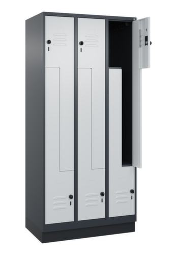 Die wichtigsten Maße des C+P Garderobenschranks Classic Plus auf einen Blick:Je Abteil eine Kleiderstange mit 3 verdrehsicheren Doppelschiebehaken. Flügeltür mit Etikettenrahmen und Lüftungsschlitzen. Die innenliegenden Drehbolzen der einschlagenden Türen bieten den Vorteil einer sauberen Optik, da keine Schrauben oder Scharniere von außen sichtbar sind. Dadurch wird das Design des Schrankes nicht beeinträchtigt und das gesamte Möbelstück wirkt hochwertiger. Damit ist auch die glatte Oberfläche leichter zu reinigen, da keine Schmutz- oder Staubablagerungen an unzugänglichen Stellen zu befürchten sind. Jede Tür ist serienmäßig mit einer Anschlagsdämpfung ausgestattet, so dass, auch durch ein schwungvolles Schließen, die Tür nicht zuknallt. Das trägt nicht nur zu einer angenehmeren Geräuschkulisse bei, sondern schont auch den Stahlschrank vor Beschädigungen. Von der Natur inspiriert schafft der BIONIC Steel Frame eine besonders effiziente und stabile Konstruktion. Durch eine raffinierte innere Struktur aus Faltungen, Streben und Zwischenräumen, sowie höhere Materialstärke an entscheidenden Stellen, wie z. B. im vorderen Bereich der Seitenwände und in den Trennwand- und Kastenprofilen, wird die Verwindungssteifigkeit zusätzlich erhöht. Verschließbar mit Sicherheits-Drehriegel für Vorhängeschloss. Das Sicherheitsschloss ist besonders aufbruchsicher, da es im verschlossenen Zustand durchdreht und erst nach Entfernung des Schlosses einrastet. Passend für alle Vorhängeschlösser mit einer Bügelstärke von 6 - 8 mm. Die zusätzlichen Lüftungsöffnungen im Abteil, kombiniert mit den Lüftungsschlitzen in der Tür, verbessern den Luftstrom. Dadurch wird der Schrankinhalt besser belüftet und trocknet schneller, ohne unangenehme Gerüche zu verursachen. Der untergebaute Sockel sorgt dafür, dass das Gewicht des Schrankes gleichmäßig auf dem Boden verteilt wird. Dies erhöht die Stabilität und der Schrank kann schwerer Lasten aufnehmen, als ein Schrank mit Füßen. Außerdem können Schmutz, Staub und Feuchtigkeit nicht unter den Schrank gelangen, was die Reinigungsfläche verkleinert. Konstruktion aus Stahl, stabil verschweißt. Das macht die Konstruktion besonders robust und widerstandsfähig und somit langlebiger. Die verschweißten Ecken und Kanten des Korpus gewährleisten eine höhere Dichtigkeit und somit eine bessere Schutzfunktion gegen Staub, Feuchtigkeit und Schmutz als eine geschraubte Konstruktion. Zudem sind keine regelmäßigen Wartungsarbeiten und Nachjustierungen nötig. Korpus mit Einbrennlackierung in RAL7016 Anthrazitgrau, Front mit Einbrennlackierung in RAL7035 Lichtgrau.
