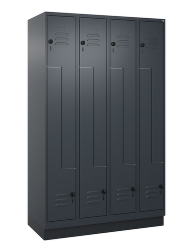 Die wichtigsten Maße des C+P Garderobenschranks Classic Plus auf einen Blick:Je Abteil eine Kleiderstange mit 3 verdrehsicheren Doppelschiebehaken. Flügeltür mit Etikettenrahmen und Lüftungsschlitzen. Die innenliegenden Drehbolzen der einschlagenden Türen bieten den Vorteil einer sauberen Optik, da keine Schrauben oder Scharniere von außen sichtbar sind. Dadurch wird das Design des Schrankes nicht beeinträchtigt und das gesamte Möbelstück wirkt hochwertiger. Damit ist auch die glatte Oberfläche leichter zu reinigen, da keine Schmutz- oder Staubablagerungen an unzugänglichen Stellen zu befürchten sind. Jede Tür ist serienmäßig mit einer Anschlagsdämpfung ausgestattet, so dass, auch durch ein schwungvolles Schließen, die Tür nicht zuknallt. Das trägt nicht nur zu einer angenehmeren Geräuschkulisse bei, sondern schont auch den Stahlschrank vor Beschädigungen. Von der Natur inspiriert schafft der BIONIC Steel Frame eine besonders effiziente und stabile Konstruktion. Durch eine raffinierte innere Struktur aus Faltungen, Streben und Zwischenräumen, sowie höhere Materialstärke an entscheidenden Stellen, wie z. B. im vorderen Bereich der Seitenwände und in den Trennwand- und Kastenprofilen, wird die Verwindungssteifigkeit zusätzlich erhöht. Verschließbar mit Sicherheits-Drehriegel für Vorhängeschloss. Das Sicherheitsschloss ist besonders aufbruchsicher, da es im verschlossenen Zustand durchdreht und erst nach Entfernung des Schlosses einrastet. Passend für alle Vorhängeschlösser mit einer Bügelstärke von 6 - 8 mm. Die zusätzlichen Lüftungsöffnungen im Abteil, kombiniert mit den Lüftungsschlitzen in der Tür, verbessern den Luftstrom. Dadurch wird der Schrankinhalt besser belüftet und trocknet schneller, ohne unangenehme Gerüche zu verursachen. Der untergebaute Sockel sorgt dafür, dass das Gewicht des Schrankes gleichmäßig auf dem Boden verteilt wird. Dies erhöht die Stabilität und der Schrank kann schwerer Lasten aufnehmen, als ein Schrank mit Füßen. Außerdem können Schmutz, Staub und Feuchtigkeit nicht unter den Schrank gelangen, was die Reinigungsfläche verkleinert. Konstruktion aus Stahl, stabil verschweißt. Das macht die Konstruktion besonders robust und widerstandsfähig und somit langlebiger. Die verschweißten Ecken und Kanten des Korpus gewährleisten eine höhere Dichtigkeit und somit eine bessere Schutzfunktion gegen Staub, Feuchtigkeit und Schmutz als eine geschraubte Konstruktion. Zudem sind keine regelmäßigen Wartungsarbeiten und Nachjustierungen nötig. Korpus mit Einbrennlackierung in RAL7016 Anthrazitgrau, Front mit Einbrennlackierung in RAL7016 Anthrazitgrau.