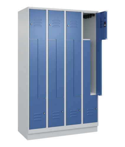Die wichtigsten Maße des C+P Garderobenschranks Classic Plus auf einen Blick:Je Abteil eine Kleiderstange mit 3 verdrehsicheren Doppelschiebehaken. Flügeltür mit Etikettenrahmen und Lüftungsschlitzen. Die innenliegenden Drehbolzen der einschlagenden Türen bieten den Vorteil einer sauberen Optik, da keine Schrauben oder Scharniere von außen sichtbar sind. Dadurch wird das Design des Schrankes nicht beeinträchtigt und das gesamte Möbelstück wirkt hochwertiger. Damit ist auch die glatte Oberfläche leichter zu reinigen, da keine Schmutz- oder Staubablagerungen an unzugänglichen Stellen zu befürchten sind. Jede Tür ist serienmäßig mit einer Anschlagsdämpfung ausgestattet, so dass, auch durch ein schwungvolles Schließen, die Tür nicht zuknallt. Das trägt nicht nur zu einer angenehmeren Geräuschkulisse bei, sondern schont auch den Stahlschrank vor Beschädigungen. Von der Natur inspiriert schafft der BIONIC Steel Frame eine besonders effiziente und stabile Konstruktion. Durch eine raffinierte innere Struktur aus Faltungen, Streben und Zwischenräumen, sowie höhere Materialstärke an entscheidenden Stellen, wie z. B. im vorderen Bereich der Seitenwände und in den Trennwand- und Kastenprofilen, wird die Verwindungssteifigkeit zusätzlich erhöht. Verschließbar mit Zylinderschloss. Die zusätzlichen Lüftungsöffnungen im Abteil, kombiniert mit den Lüftungsschlitzen in der Tür, verbessern den Luftstrom. Dadurch wird der Schrankinhalt besser belüftet und trocknet schneller, ohne unangenehme Gerüche zu verursachen. Der untergebaute Sockel sorgt dafür, dass das Gewicht des Schrankes gleichmäßig auf dem Boden verteilt wird. Dies erhöht die Stabilität und der Schrank kann schwerer Lasten aufnehmen, als ein Schrank mit Füßen. Außerdem können Schmutz, Staub und Feuchtigkeit nicht unter den Schrank gelangen, was die Reinigungsfläche verkleinert. Konstruktion aus Stahl, stabil verschweißt. Das macht die Konstruktion besonders robust und widerstandsfähig und somit langlebiger. Die verschweißten Ecken und Kanten des Korpus gewährleisten eine höhere Dichtigkeit und somit eine bessere Schutzfunktion gegen Staub, Feuchtigkeit und Schmutz als eine geschraubte Konstruktion. Zudem sind keine regelmäßigen Wartungsarbeiten und Nachjustierungen nötig. Korpus mit Einbrennlackierung in RAL7035 Lichtgrau, Front mit Einbrennlackierung in RAL5023 Fernblau.
