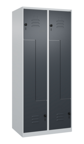 Die wichtigsten Maße des C+P Garderobenschranks Classic Plus auf einen Blick:Je Abteil eine Kleiderstange mit 3 verdrehsicheren Doppelschiebehaken. Flügeltür mit Etikettenrahmen und Lüftungsschlitzen. Die innenliegenden Drehbolzen der einschlagenden Türen bieten den Vorteil einer sauberen Optik, da keine Schrauben oder Scharniere von außen sichtbar sind. Dadurch wird das Design des Schrankes nicht beeinträchtigt und das gesamte Möbelstück wirkt hochwertiger. Damit ist auch die glatte Oberfläche leichter zu reinigen, da keine Schmutz- oder Staubablagerungen an unzugänglichen Stellen zu befürchten sind. Jede Tür ist serienmäßig mit einer Anschlagsdämpfung ausgestattet, so dass, auch durch ein schwungvolles Schließen, die Tür nicht zuknallt. Das trägt nicht nur zu einer angenehmeren Geräuschkulisse bei, sondern schont auch den Stahlschrank vor Beschädigungen. Von der Natur inspiriert schafft der BIONIC Steel Frame eine besonders effiziente und stabile Konstruktion. Durch eine raffinierte innere Struktur aus Faltungen, Streben und Zwischenräumen, sowie höhere Materialstärke an entscheidenden Stellen, wie z. B. im vorderen Bereich der Seitenwände und in den Trennwand- und Kastenprofilen, wird die Verwindungssteifigkeit zusätzlich erhöht. Verschließbar mit Sicherheits-Drehriegel für Vorhängeschloss. Das Sicherheitsschloss ist besonders aufbruchsicher, da es im verschlossenen Zustand durchdreht und erst nach Entfernung des Schlosses einrastet. Passend für alle Vorhängeschlösser mit einer Bügelstärke von 6 - 8 mm. Die zusätzlichen Lüftungsöffnungen im Abteil, kombiniert mit den Lüftungsschlitzen in der Tür, verbessern den Luftstrom. Dadurch wird der Schrankinhalt besser belüftet und trocknet schneller, ohne unangenehme Gerüche zu verursachen. Für eine besonders schlanke und raumsparende Optik steht der Schrank ohne Sockel oder Füße direkt auf dem Boden. Lediglich Bodenausgleichsschrauben sorgen für einen wackelfreien Stand bei eventuellen Bodenunebenheiten. Der Schrankboden ist für einen erhöhten Korrosionsschutz zusätzlich verzinkt. Konstruktion aus Stahl, stabil verschweißt. Das macht die Konstruktion besonders robust und widerstandsfähig und somit langlebiger. Die verschweißten Ecken und Kanten des Korpus gewährleisten eine höhere Dichtigkeit und somit eine bessere Schutzfunktion gegen Staub, Feuchtigkeit und Schmutz als eine geschraubte Konstruktion. Zudem sind keine regelmäßigen Wartungsarbeiten und Nachjustierungen nötig. Korpus mit Einbrennlackierung in RAL7035 Lichtgrau, Front mit Einbrennlackierung in RAL7016 Anthrazitgrau.