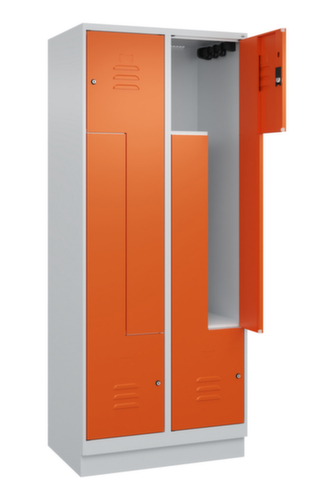 Die wichtigsten Maße des C+P Garderobenschranks Classic Plus auf einen Blick:Je Abteil eine Kleiderstange mit 3 verdrehsicheren Doppelschiebehaken. Flügeltür mit Etikettenrahmen und Lüftungsschlitzen. Die innenliegenden Drehbolzen der einschlagenden Türen bieten den Vorteil einer sauberen Optik, da keine Schrauben oder Scharniere von außen sichtbar sind. Dadurch wird das Design des Schrankes nicht beeinträchtigt und das gesamte Möbelstück wirkt hochwertiger. Damit ist auch die glatte Oberfläche leichter zu reinigen, da keine Schmutz- oder Staubablagerungen an unzugänglichen Stellen zu befürchten sind. Jede Tür ist serienmäßig mit einer Anschlagsdämpfung ausgestattet, so dass, auch durch ein schwungvolles Schließen, die Tür nicht zuknallt. Das trägt nicht nur zu einer angenehmeren Geräuschkulisse bei, sondern schont auch den Stahlschrank vor Beschädigungen. Von der Natur inspiriert schafft der BIONIC Steel Frame eine besonders effiziente und stabile Konstruktion. Durch eine raffinierte innere Struktur aus Faltungen, Streben und Zwischenräumen, sowie höhere Materialstärke an entscheidenden Stellen, wie z. B. im vorderen Bereich der Seitenwände und in den Trennwand- und Kastenprofilen, wird die Verwindungssteifigkeit zusätzlich erhöht. Verschließbar mit Zylinderschloss. Die zusätzlichen Lüftungsöffnungen im Abteil, kombiniert mit den Lüftungsschlitzen in der Tür, verbessern den Luftstrom. Dadurch wird der Schrankinhalt besser belüftet und trocknet schneller, ohne unangenehme Gerüche zu verursachen. Der untergebaute Sockel sorgt dafür, dass das Gewicht des Schrankes gleichmäßig auf dem Boden verteilt wird. Dies erhöht die Stabilität und der Schrank kann schwerer Lasten aufnehmen, als ein Schrank mit Füßen. Außerdem können Schmutz, Staub und Feuchtigkeit nicht unter den Schrank gelangen, was die Reinigungsfläche verkleinert. Konstruktion aus Stahl, stabil verschweißt. Das macht die Konstruktion besonders robust und widerstandsfähig und somit langlebiger. Die verschweißten Ecken und Kanten des Korpus gewährleisten eine höhere Dichtigkeit und somit eine bessere Schutzfunktion gegen Staub, Feuchtigkeit und Schmutz als eine geschraubte Konstruktion. Zudem sind keine regelmäßigen Wartungsarbeiten und Nachjustierungen nötig. Korpus mit Einbrennlackierung in RAL7035 Lichtgrau, Front mit Einbrennlackierung in RAL2004 Reinorange.