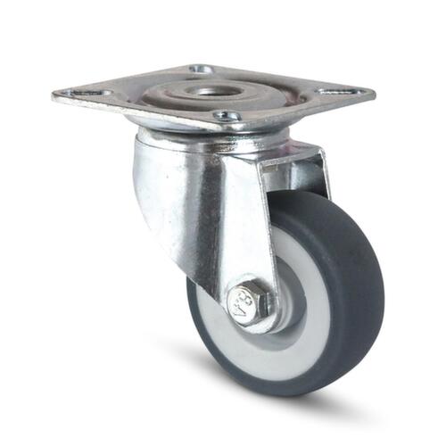 Mit bodenschonender TPE-Bereifung. Durchmesser 50 mm. Nabe mit stoßunempfindlichem und korrosionsbeständigem Gleitlager. Naben Länge 22 mm. Felge aus bruchsicherem Polypropylen. Gehäuse aus Stahl galvanisch verzinkt und blau passiviert. Befestigung mit Platte.