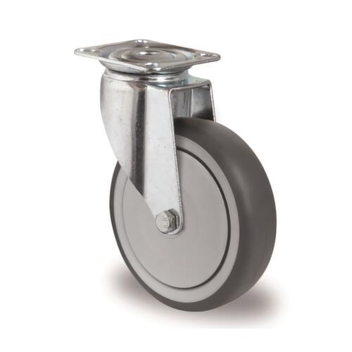 Mit bodenschonender TPE-Bereifung. Durchmesser 100 mm. Nabe mit für den Dauerbetrieb geeignetem Kugellager. Naben Länge 36 mm. Felge aus bruchsicherem Polypropylen. Gehäuse aus Stahl galvanisch verzinkt und blau passiviert. Befestigung mit Platte.