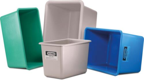 Die wichtigsten Maße des Cemo Großbehälters auf einen Blick:Aus GFK (glasfaserverstärkter Kunststoff) in blau. Die Wände sind geschlossen und mit glatten, nahtlosen Flächen ausgestattet durch die sich der Behälter optimal reinigen lässt. Standfläche für sicheren Stand. Der Behälter kann mithilfe des verstärkten umlaufenden Griffrands auch im befüllten Zustand angehoben werden. Platzsparend ineinander stapelbar. Temperaturbeständig von -30 °C bis +40 °C, kurzzeitig bis +90 °C. Geeignet für aggressive Medien.