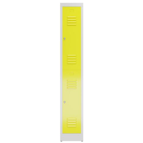 Je Abteil 1 Kleiderstange und 2 Doppelhaken pro Fach. Flügeltür mit Lüftungsschlitzen. Verschließbar mit Drehriegelverschluss für Vorhängeschloss. Jedes Abteil einzeln verschließbar. Der untergebaute Sockel sorgt dafür, dass das Gewicht des Schrankes gleichmäßig auf dem Boden verteilt wird. Dies erhöht die Stabilität und der Schrank kann schwerer Lasten aufnehmen, als ein Schrank mit Füßen. Außerdem können Schmutz, Staub und Feuchtigkeit nicht unter den Schrank gelangen, was die Reinigungsfläche verkleinert. Konstruktion aus Stahl, verschweißt. Korpus mit elektrostatischer Pulverbeschichtung in RAL7035 Lichtgrau, Front mit elektrostatischer Pulverbeschichtung in RAL1018 Zinkgelb.