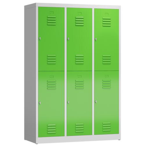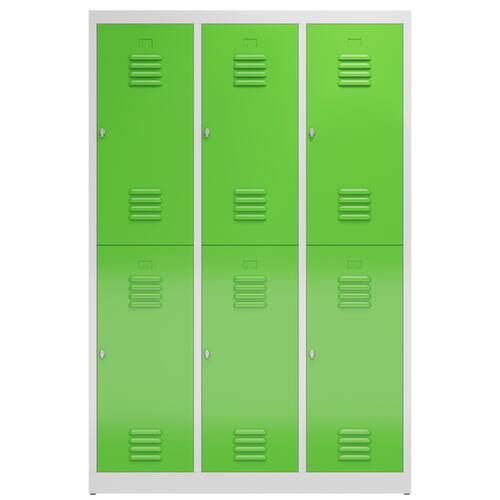 Je Abteil 1 Kleiderstange und 2 Doppelhaken pro Fach. Flügeltür mit Lüftungsschlitzen. Verschließbar mit Drehriegelverschluss für Vorhängeschloss. Jedes Abteil einzeln verschließbar. Der untergebaute Sockel sorgt dafür, dass das Gewicht des Schrankes gleichmäßig auf dem Boden verteilt wird. Dies erhöht die Stabilität und der Schrank kann schwerer Lasten aufnehmen, als ein Schrank mit Füßen. Außerdem können Schmutz, Staub und Feuchtigkeit nicht unter den Schrank gelangen, was die Reinigungsfläche verkleinert. Konstruktion aus Stahl, verschweißt. Korpus mit elektrostatischer Pulverbeschichtung in RAL7035 Lichtgrau, Front mit elektrostatischer Pulverbeschichtung in RAL6018 Gelbgrün.