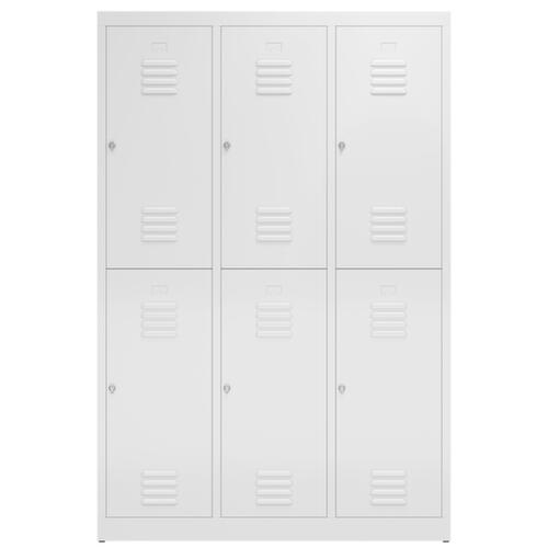 Je Abteil 1 Kleiderstange und 2 Doppelhaken pro Fach. Flügeltür mit Lüftungsschlitzen. Verschließbar mit Drehriegelverschluss für Vorhängeschloss. Jedes Abteil einzeln verschließbar. Der untergebaute Sockel sorgt dafür, dass das Gewicht des Schrankes gleichmäßig auf dem Boden verteilt wird. Dies erhöht die Stabilität und der Schrank kann schwerer Lasten aufnehmen, als ein Schrank mit Füßen. Außerdem können Schmutz, Staub und Feuchtigkeit nicht unter den Schrank gelangen, was die Reinigungsfläche verkleinert. Konstruktion aus Stahl, verschweißt. Korpus mit elektrostatischer Pulverbeschichtung in RAL9003 Signalweiß, Front mit elektrostatischer Pulverbeschichtung in RAL9003 Signalweiß.