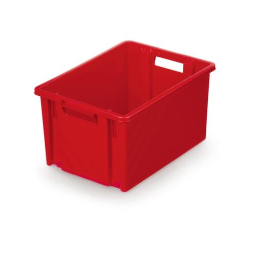 Aus bruchsicherem Polypropylen in rot. Wände geschlossen, Boden geschlossen. Einfach zu tragen durch Durchfassgriffe. Durch eine 180°-Drehung ineinander schachtelbar.