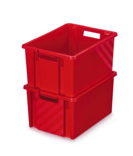 Aus bruchsicherem Polypropylen in rot. Wände geschlossen, Boden geschlossen. Einfach zu tragen durch Durchfassgriffe. Durch eine 180°-Drehung ineinander schachtelbar.