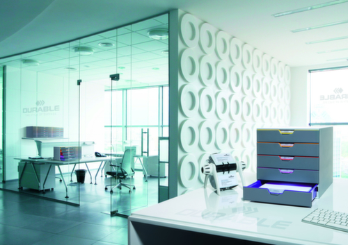"longDescription": "<h2>Schubladenbox</h2><strong>klassisches Design mit modernem Touch</strong><br><ul><li><strong>Perfekt organisiert und alles griffbereit</strong> - mit feinen Farblinien bei geschlossenen Schubladen</li><li><strong>Individuell beschriftbar</strong> - inklusive Beschriftungsfenstern und auswechselbaren Einsteck-Etiketten</li><li><strong>Leicht und leise</strong> - geräuschfreie Schubladen mit Auszugssperre</li><li><strong>Stabil</strong> - aus Kunststoff</li><li><strong>Standfest</strong> - mit rutschfesten Füßen</li></ul><br>Ordnung schaffen mit System und Design! <br>Die Schubladenbox VARICOLOR® von Durable hilft nicht nur dabei noch mehr Ordnung zu schaffen, sie sieht dabei auch noch toll aus! Feine Farblinien an den Schubladen setzen sich von dem schlichten grauen Korpus ab. Damit überzeugt die Schubladenbox nicht nur optisch, sondern auch funktional! Denn die farbigen Linien helfen bei der besseren Orientierung und Organisation auf Ihrem Schreibtisch.<br><br>Die Schubladenbox besteht aus Kunststoff. Der Korpus ist einem hellen grau, die Schubladenfronten sind dunkelgrau. Von innen sind die Schubladen bunt. Die Farbe ist von außen bei geschlossenen Schubladen als dünne Linie zu erkennen. Jede Schublade ist in einer anderen Farbe, die durch die entsprechende Anordnung einen schönen Farbverlauf ergeben. So muss sich die Box nicht verstecken und kann auch gut sichtbar auf Ihren Schreibtisch stehen.<br><br>Die Schubladen sind für Formate bis DIN A4, C4 sowie Folio- und Letter-Size-Formate geeignet. Also passend für die gängigsten Papierformate im Büro.<br>Ordnung am Arbeitsplatz braucht auch Struktur! Für eine optimale Orientierung nutzen Sie doch einfach die beiliegenden Beschriftungsfenster. Diese sind mit leicht auswechselbaren Einsteck-Etiketten individuell zu beschriften. Auch eine Beschriftung mit dem Computer ist möglich. Damit wissen Sie und Andere genau, wo was zu finden ist.<br><br>Die Schubladen verfügen über einen geräuschfreien Leichtlauf. Kein Ruckeln an den Schubladen, keine störenden Geräusche mehr. Zudem ist die Schubladenbox mit einer Auszugssperre ausgestattet. So wird verhindert, dass die Schublade ausversehen komplett rausgezogen wird. Fast jeder kennt das Problem und das danach folgende Geduldsspiel, um die Schublade samt Inhalt wieder in die richtige Spur zu bekommen. Die Auszugssperre wird dies verhindern!<br><br>Auf der Unterseite der Schubladenbox befinden sich rutschfeste Füße aus Kunststoff. Dadurch steht sie sicher an ihrem Platz. Die Box ist deswegen auch stapelbar oder aber für Reihenaufstellung auf allen Sideboards und Büroschränken mit Standardmaße geeignet. Durch das elegante Design passt Schubladenbox nahezu in jedes Umfeld.<br><br>Sie können sich zwischen einer Box mit 5, 7 oder 10 Schubladen entscheiden. Oder Sie nehmen gleich mehrere mit unterschiedlicher Anzahl an Schubladen und stellen diese neben- oder aufeinander. Das ist deshalb so gut möglich, da die Schubladenboxen trotz unterschiedlicher Anzahl an Schubladen die gleichen Außenmaße haben.<br>",